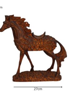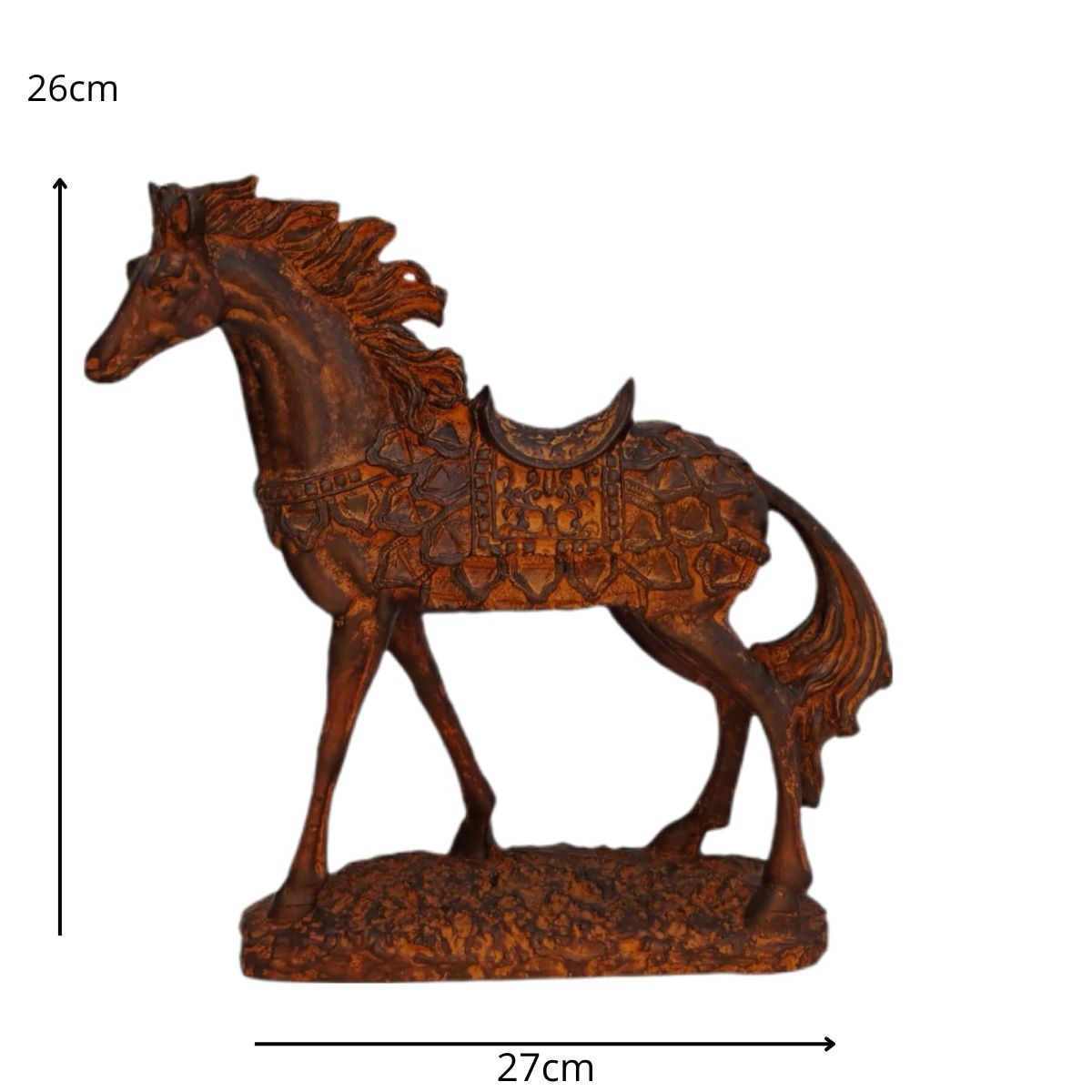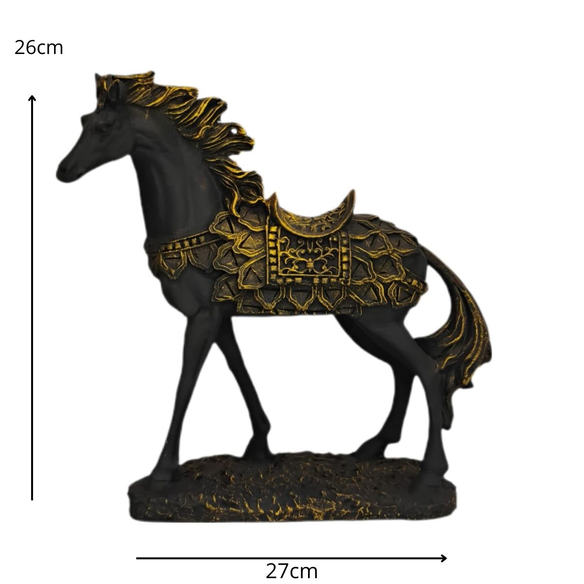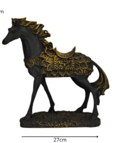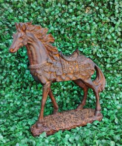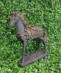 Ricamente detalhada, a peça exibe traços refinados no corpo e nos adornos da sela, transmitindo imponência e equilíbrio. Um destaque perfeito para salas, escritórios ou ambientes com decoração clássica e acolhedora.