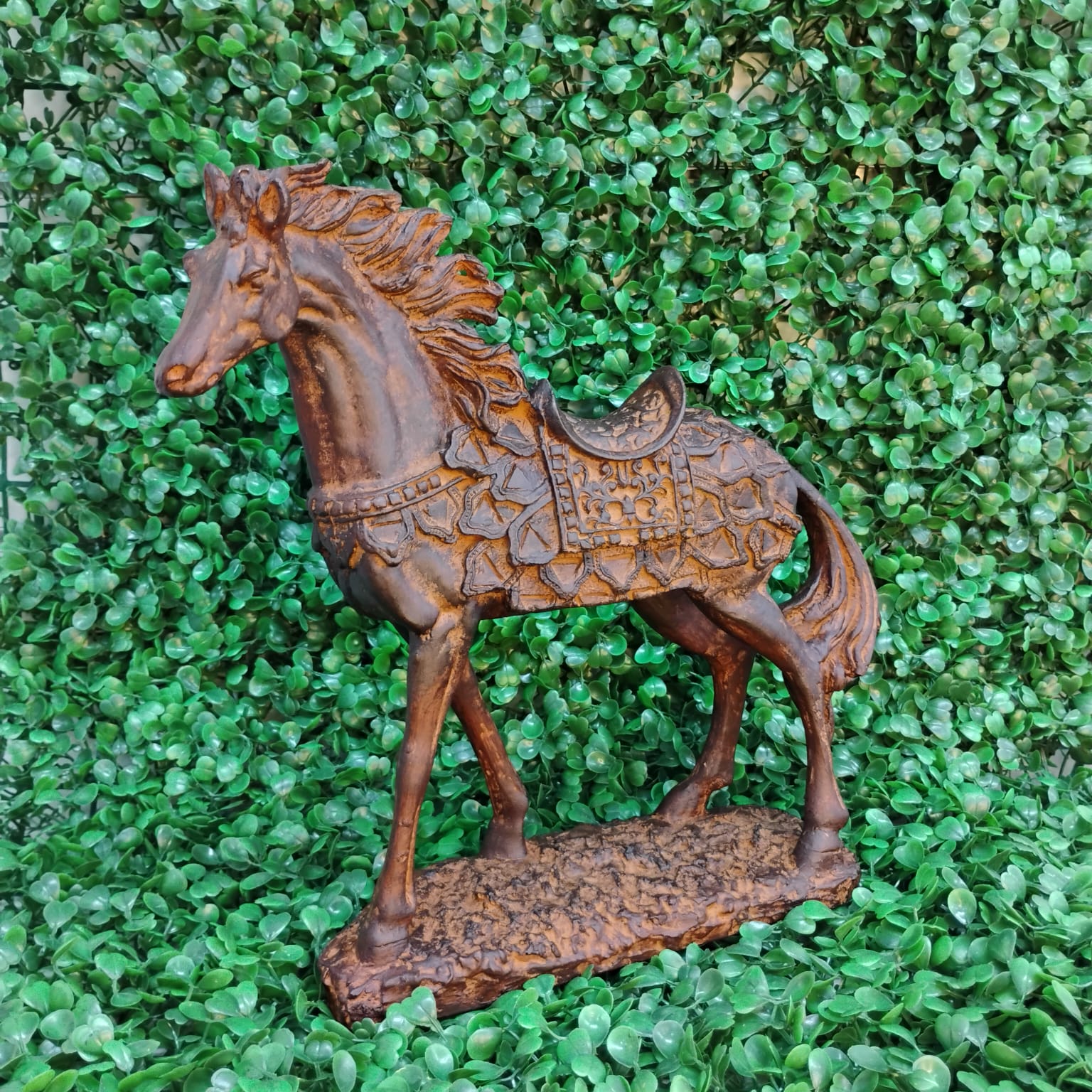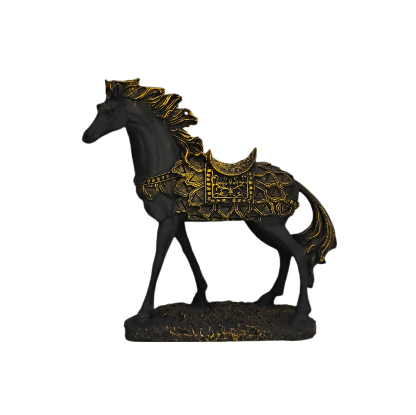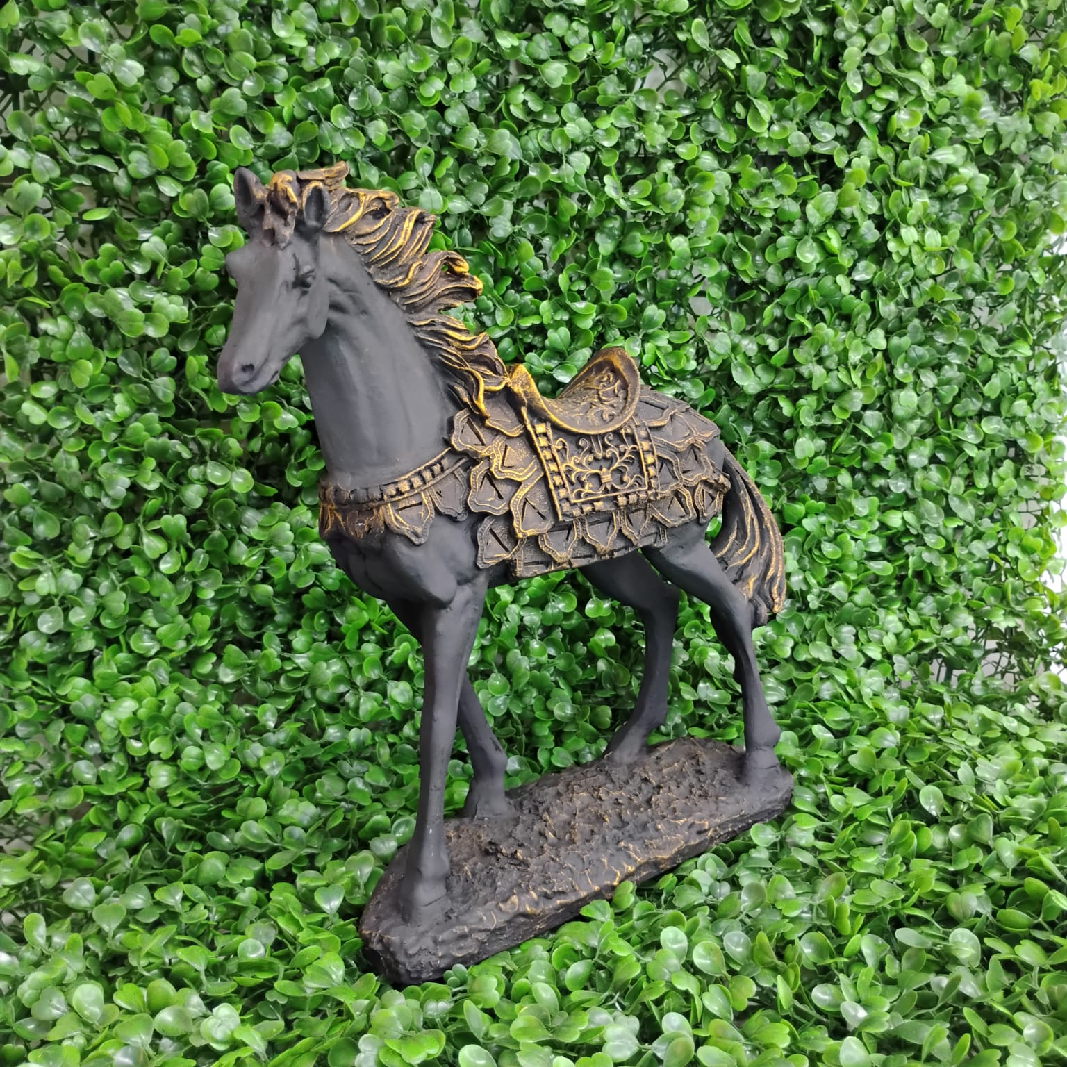 Ricamente detalhada, a peça exibe traços refinados no corpo e nos adornos da sela, transmitindo imponência e equilíbrio. Um destaque perfeito para salas, escritórios ou ambientes com decoração clássica e acolhedora.