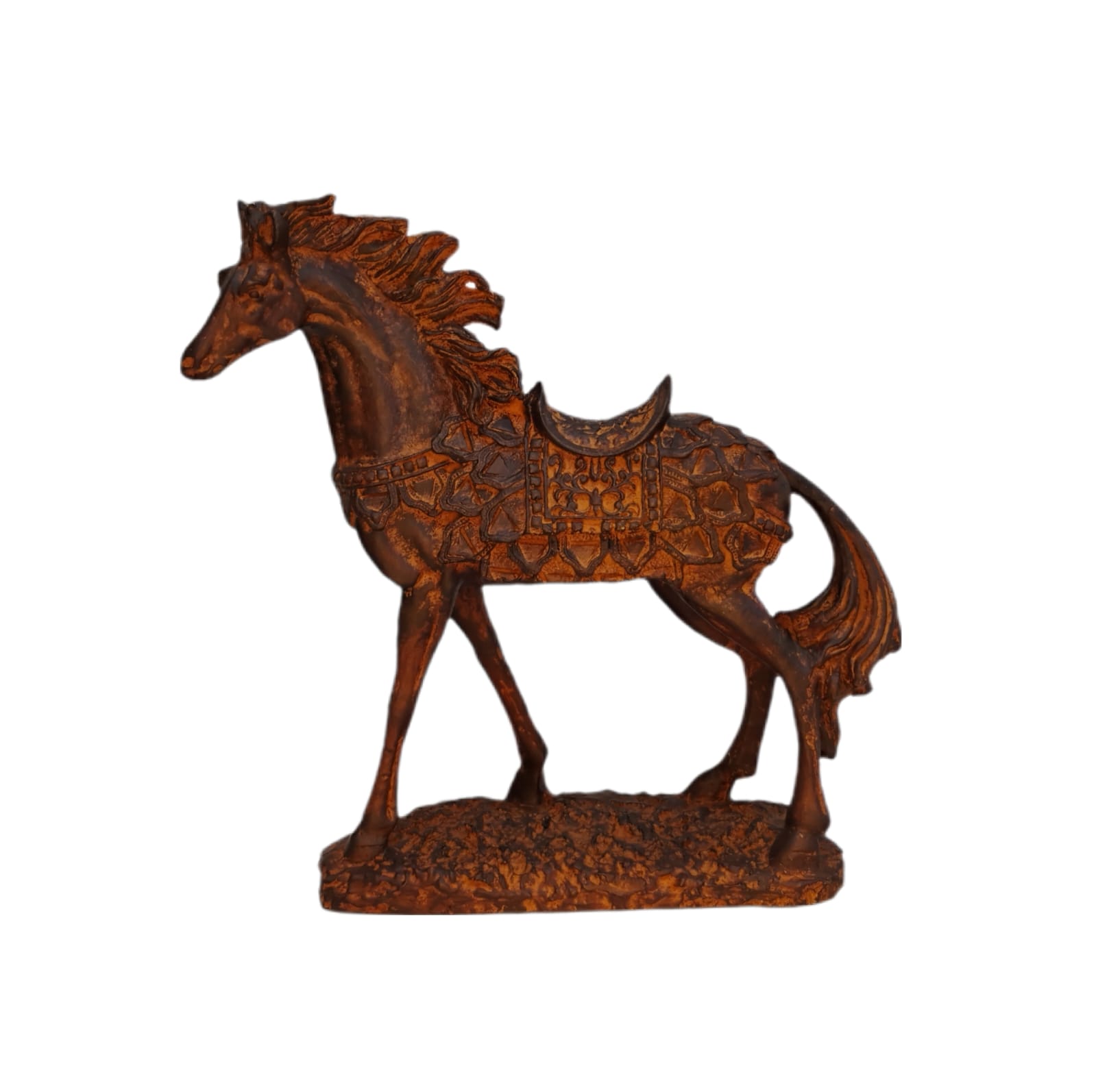 O cavalo é símbolo de liberdade, elegância e poder, representando movimento e conquista. Esta escultura em resina com acabamento marrom envelhecido traz uma presença marcante e sofisticada, ideal para quem aprecia peças que unem beleza e significado.