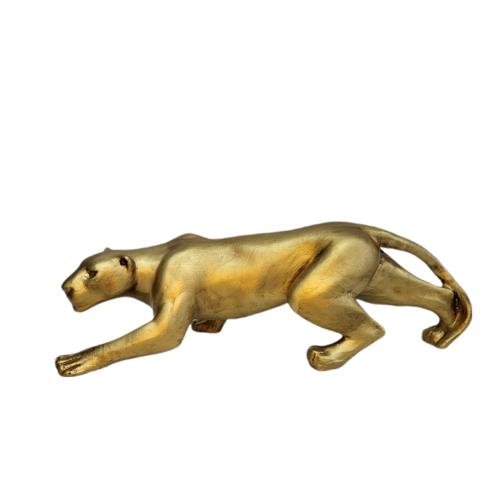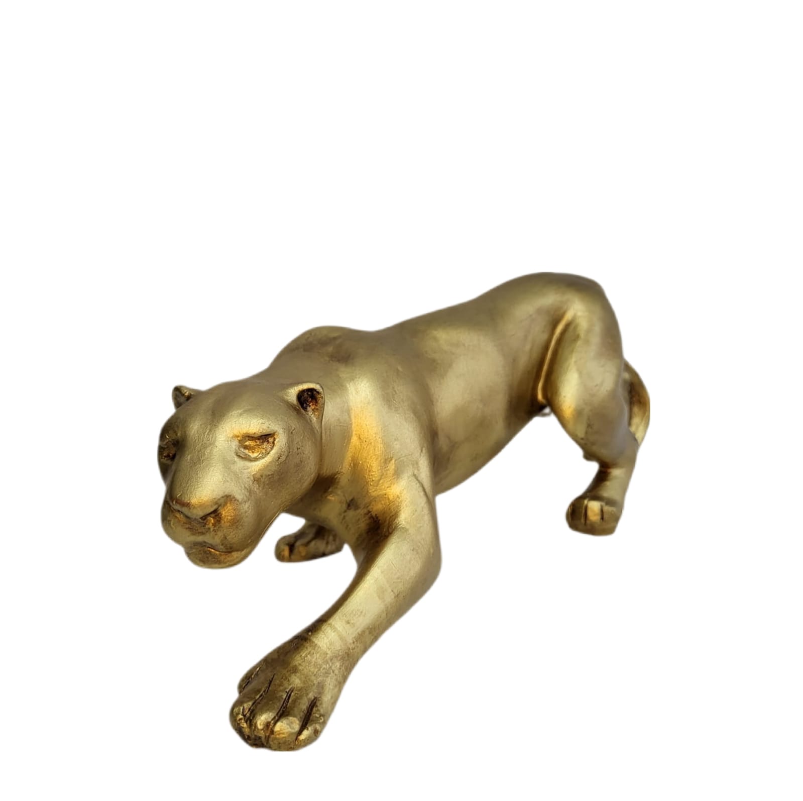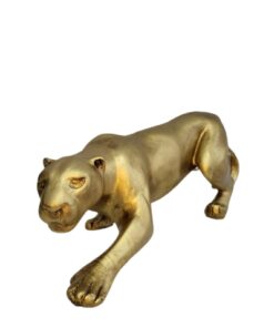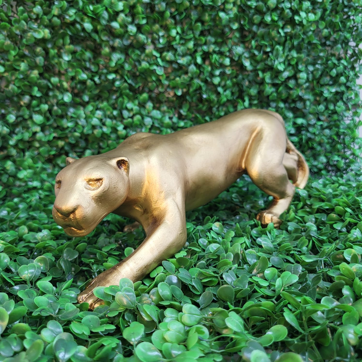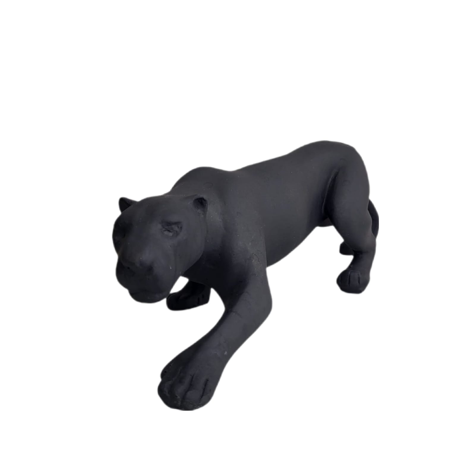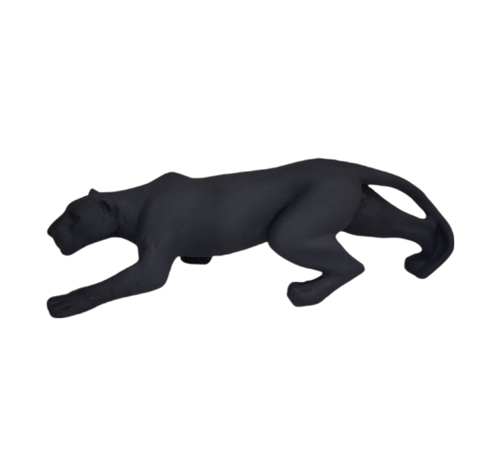 Produzida em resina de alta qualidade, a peça exibe linhas suaves e detalhamento que evidenciam a imponência e o movimento do felino, ideal para ambientes modernos, rústicos ou clássicos.