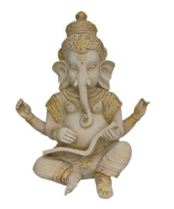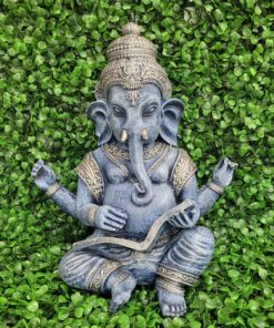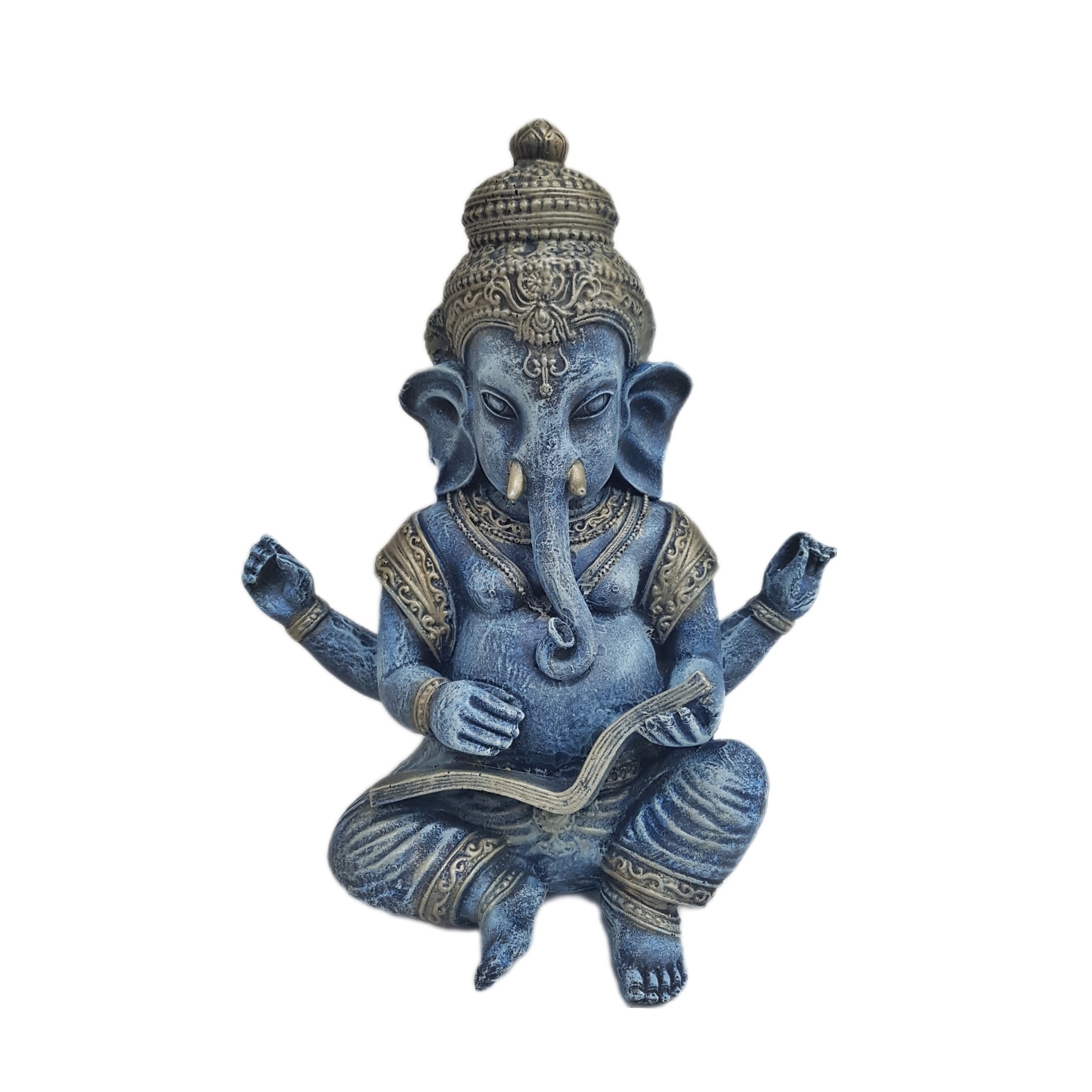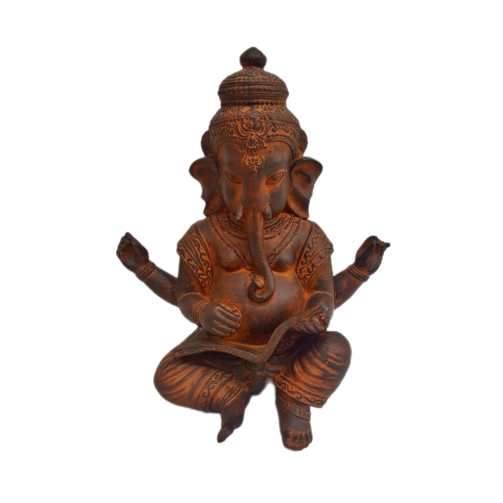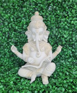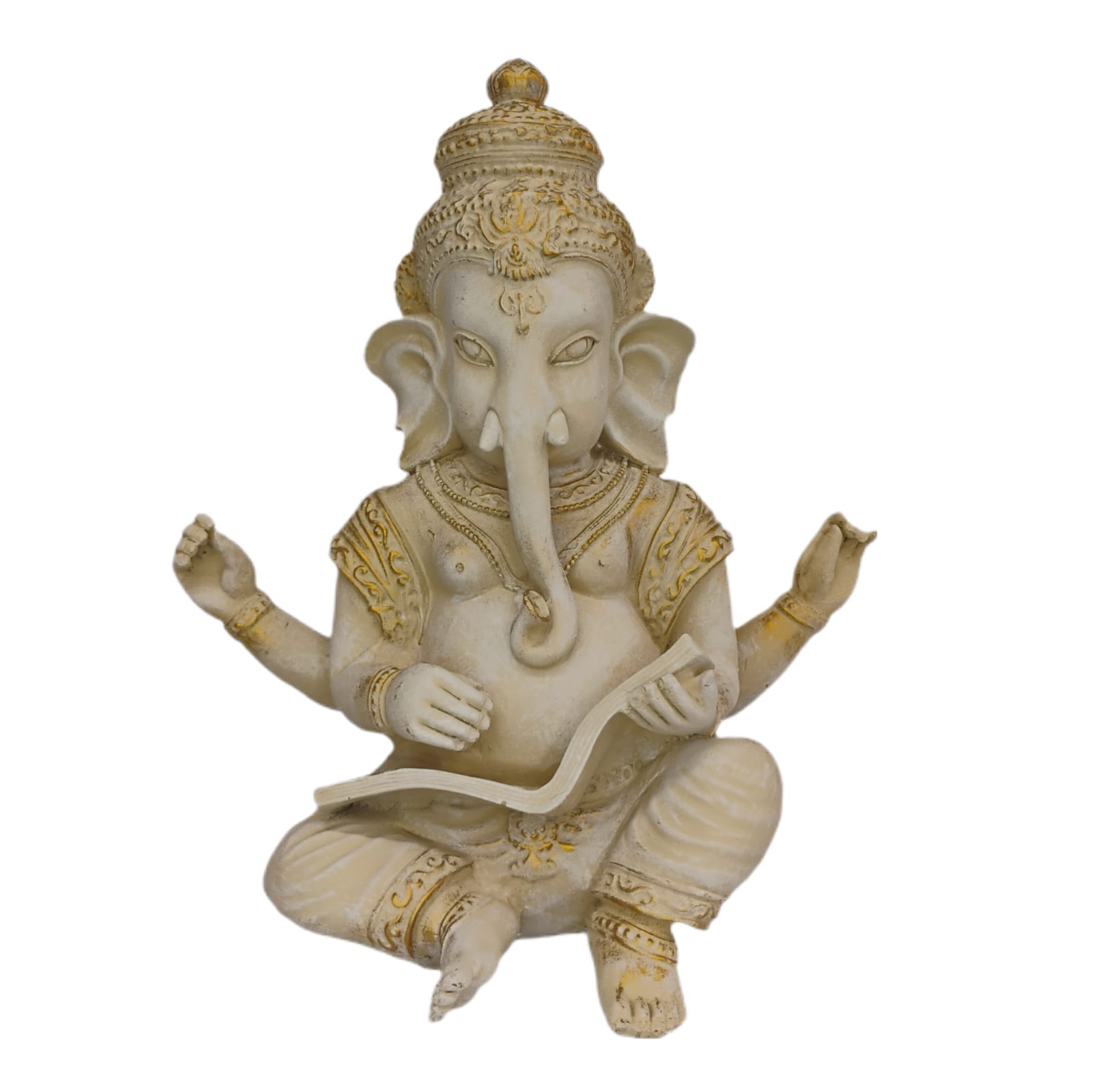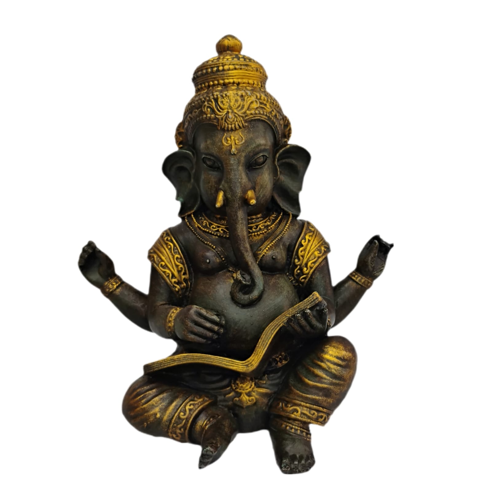 Atraia sabedoria, prosperidade e boas energias com esta belíssima estátua de Ganesha sentado com livro, símbolo de conhecimento, aprendizado e superação de obstáculos. Produzida em resina de alta qualidade, a peça possui acabamento artesanal e detalhes minuciosos que transmitem serenidade e espiritualidade.