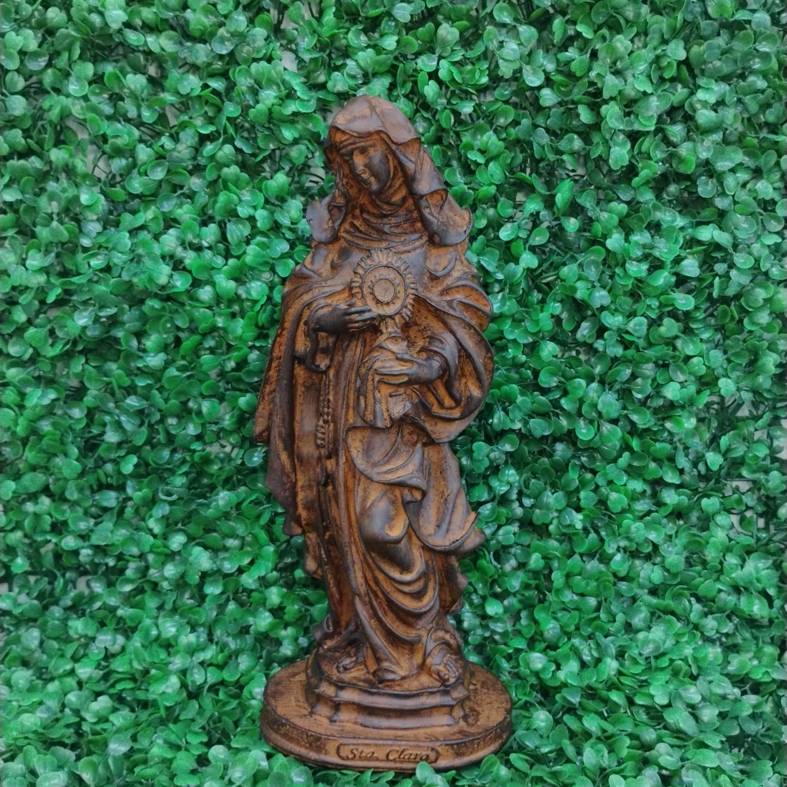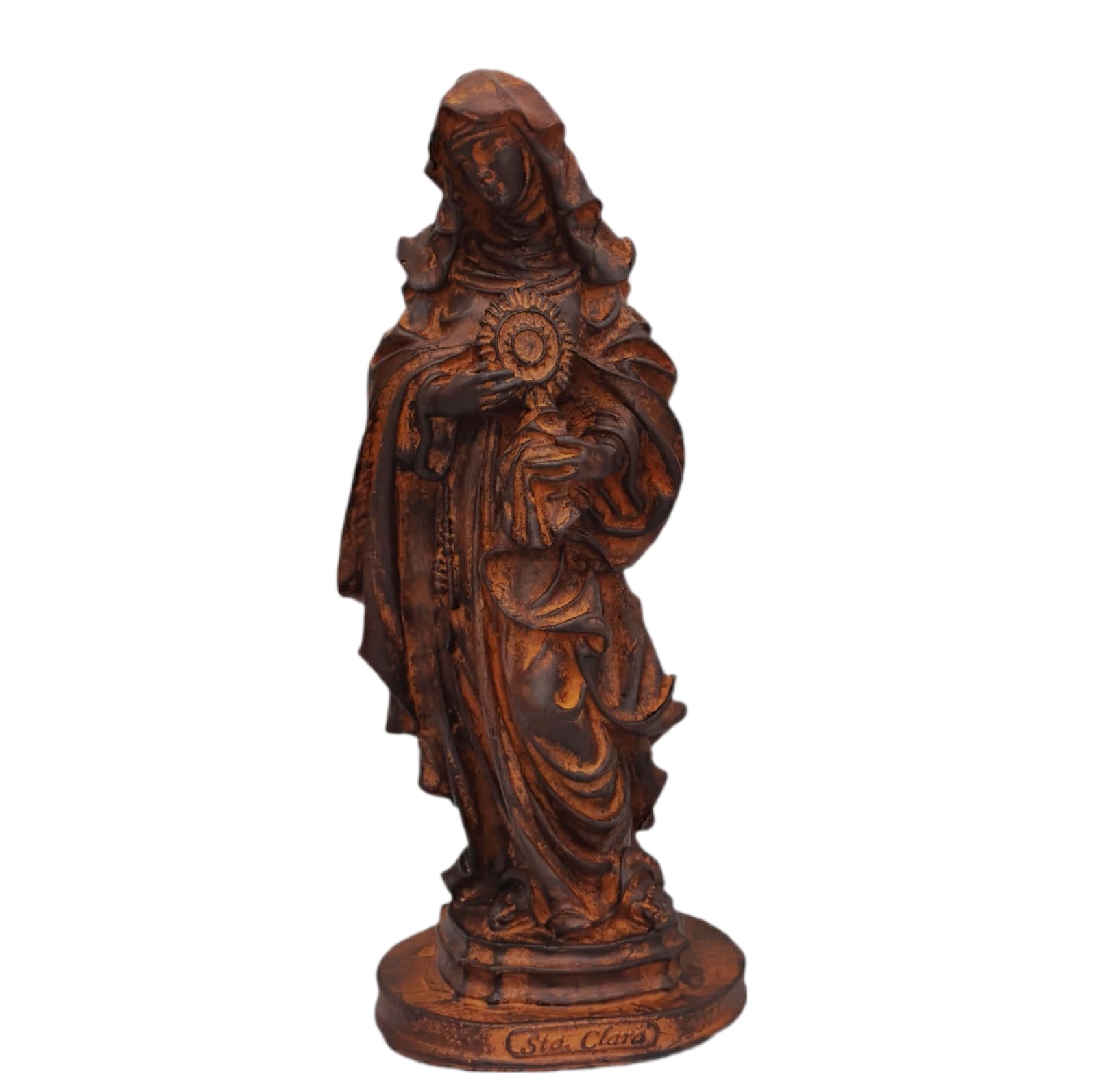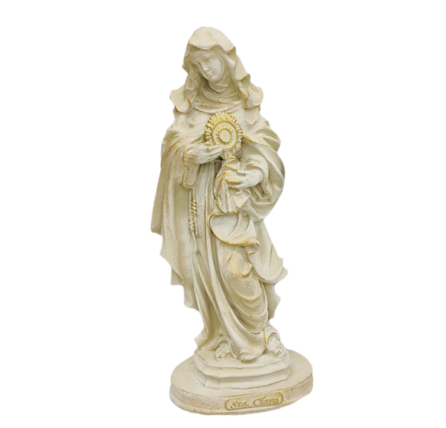 Santa Clara de Assis é conhecida por sua vida de simplicidade, fé e profundo amor à Eucaristia. Fundadora da Ordem das Clarissas, é também invocada como protetora dos lares e padroeira da televisão. Sua imagem inspira pureza, entrega e confiança na providência divina.