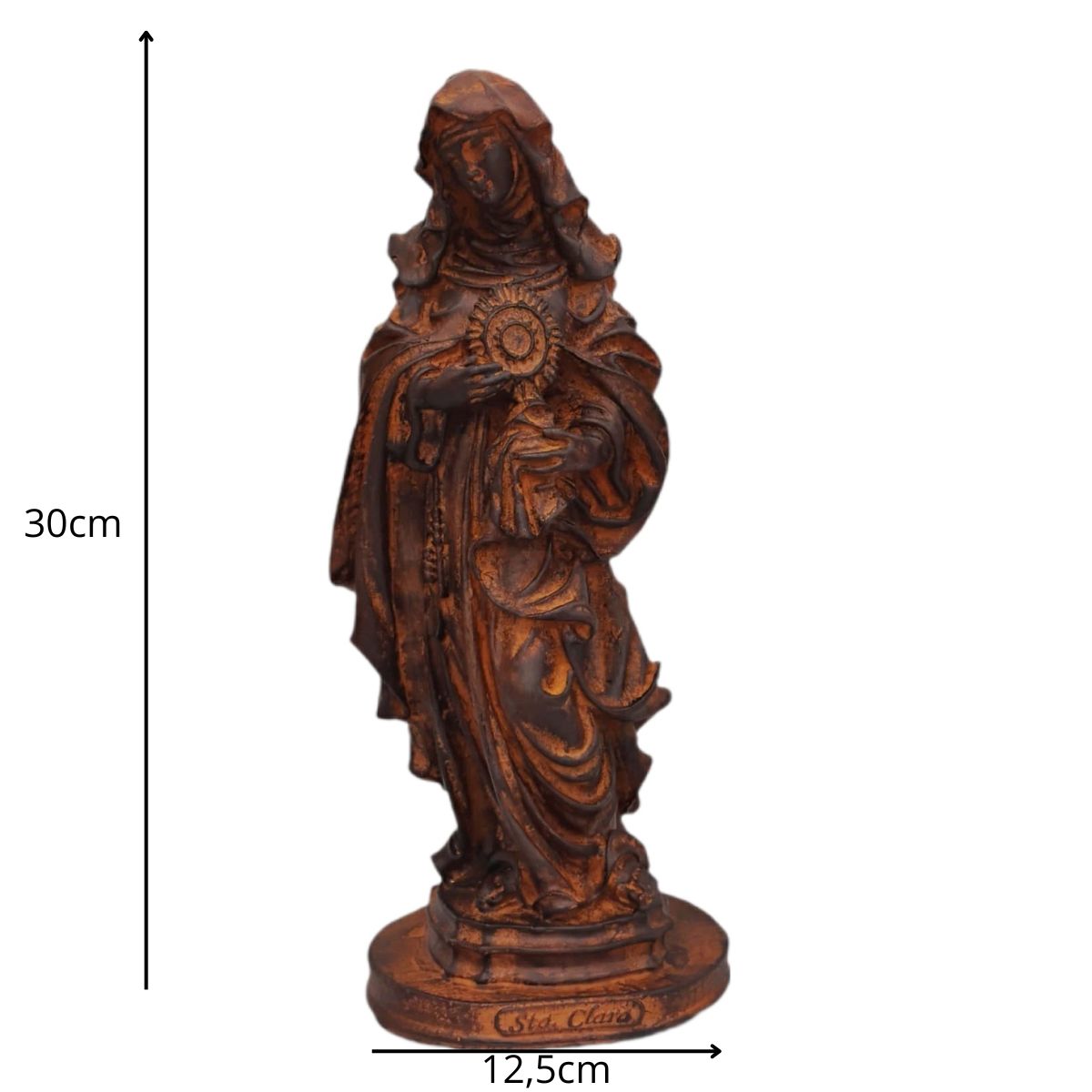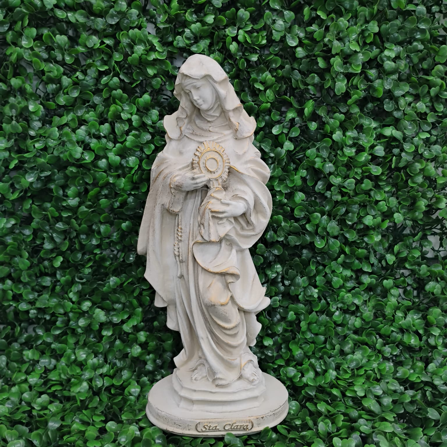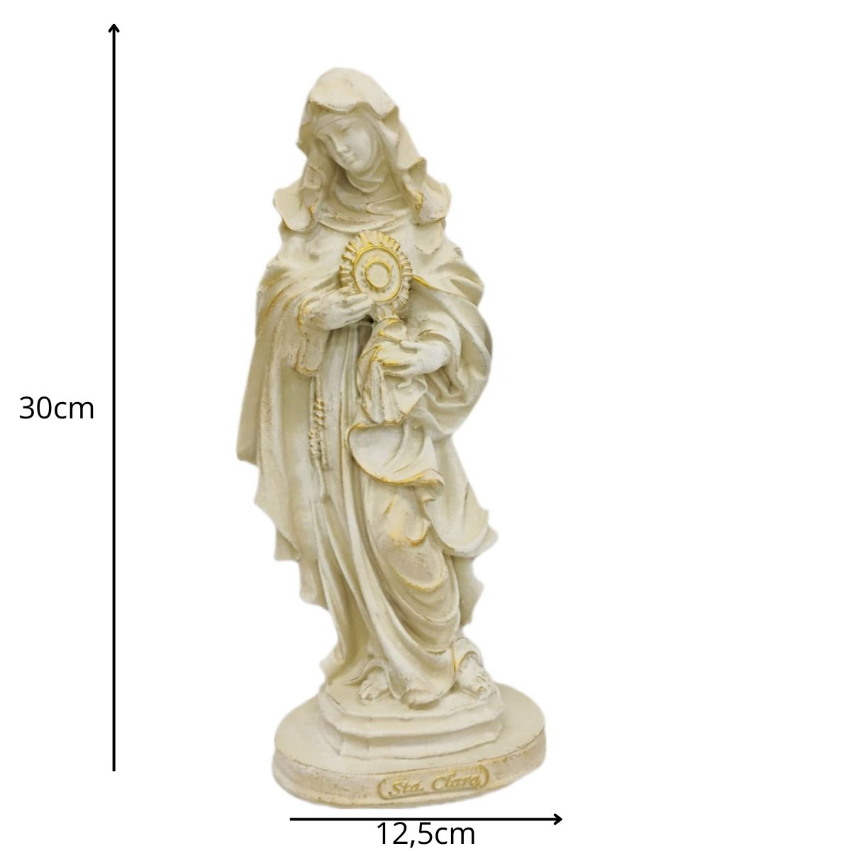Santa Clara de Assis é conhecida por sua vida de simplicidade, fé e profundo amor à Eucaristia. Fundadora da Ordem das Clarissas, é também invocada como protetora dos lares e padroeira da televisão. Sua imagem inspira pureza, entrega e confiança na providência divina.