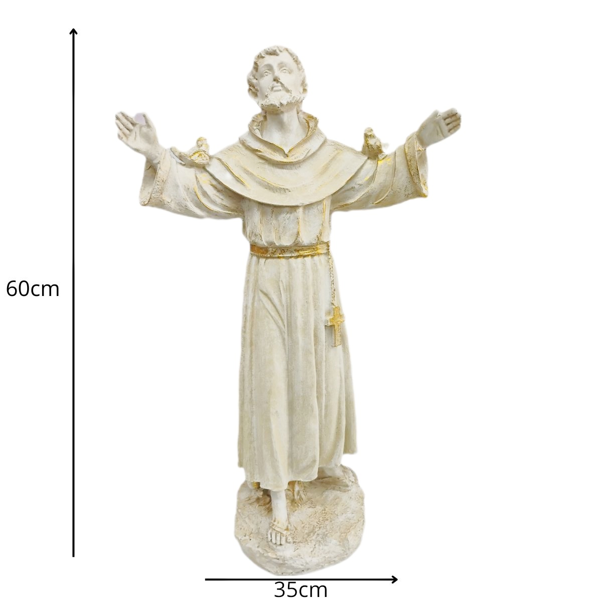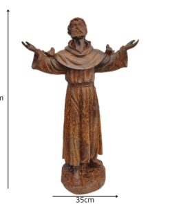 Com 60 cm de altura e 35 cm de largura, esta peça é confeccionada em resina de alta qualidade, com pintura 100% artesanal, evidenciando os detalhes do hábito franciscano e a expressão serena do santo. Ideal para oratórios, espaços de oração ou como presente especial de fé e gratidão.