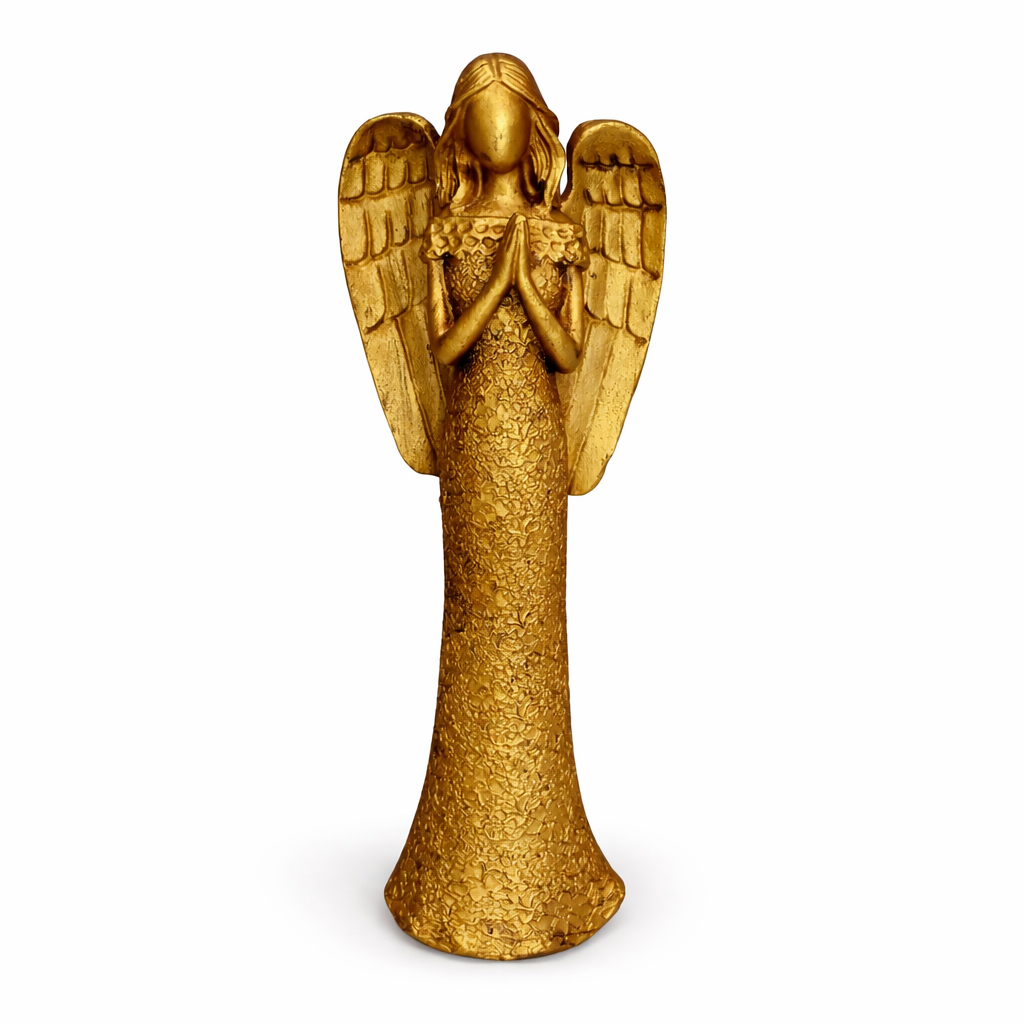 Encante seu ambiente com a delicadeza e o simbolismo desta linda anja em resina, com acabamento dourado e traços suaves que transmitem paz, proteção e amor.