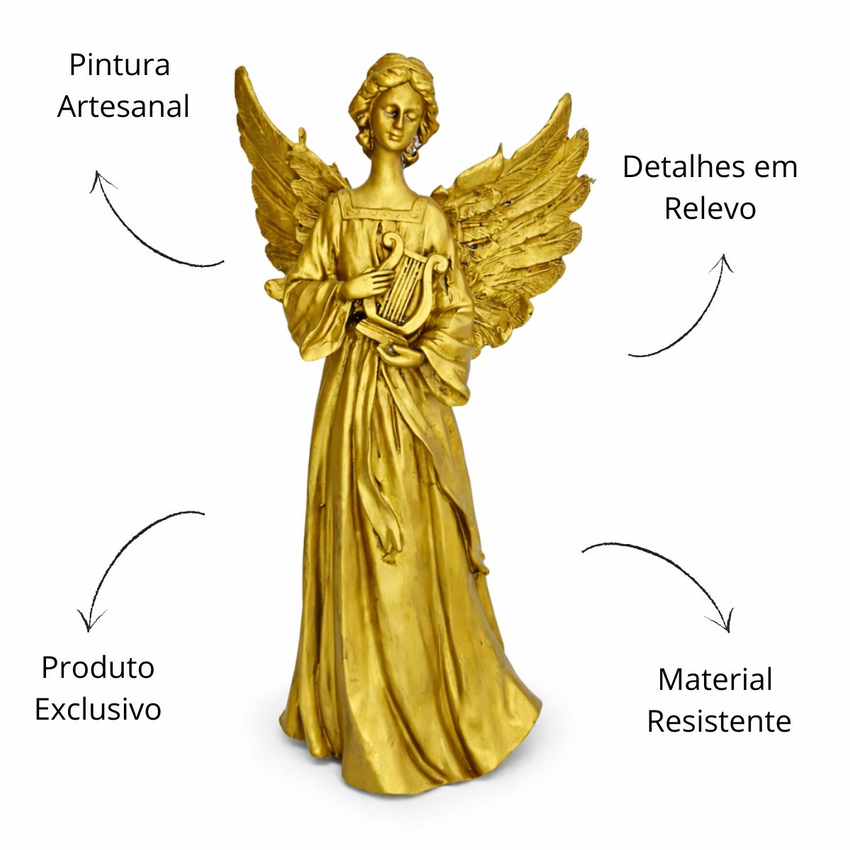 Encante seu ambiente com a beleza e a serenidade desta estátua de anjo tocando harpa, símbolo de harmonia, fé e inspiração celestial. Produzida em resina de alta qualidade, a peça possui acabamento detalhado e traços suaves que transmitem paz e espiritualidade.