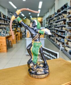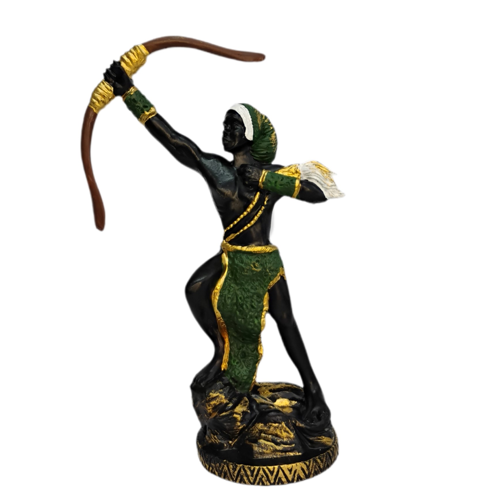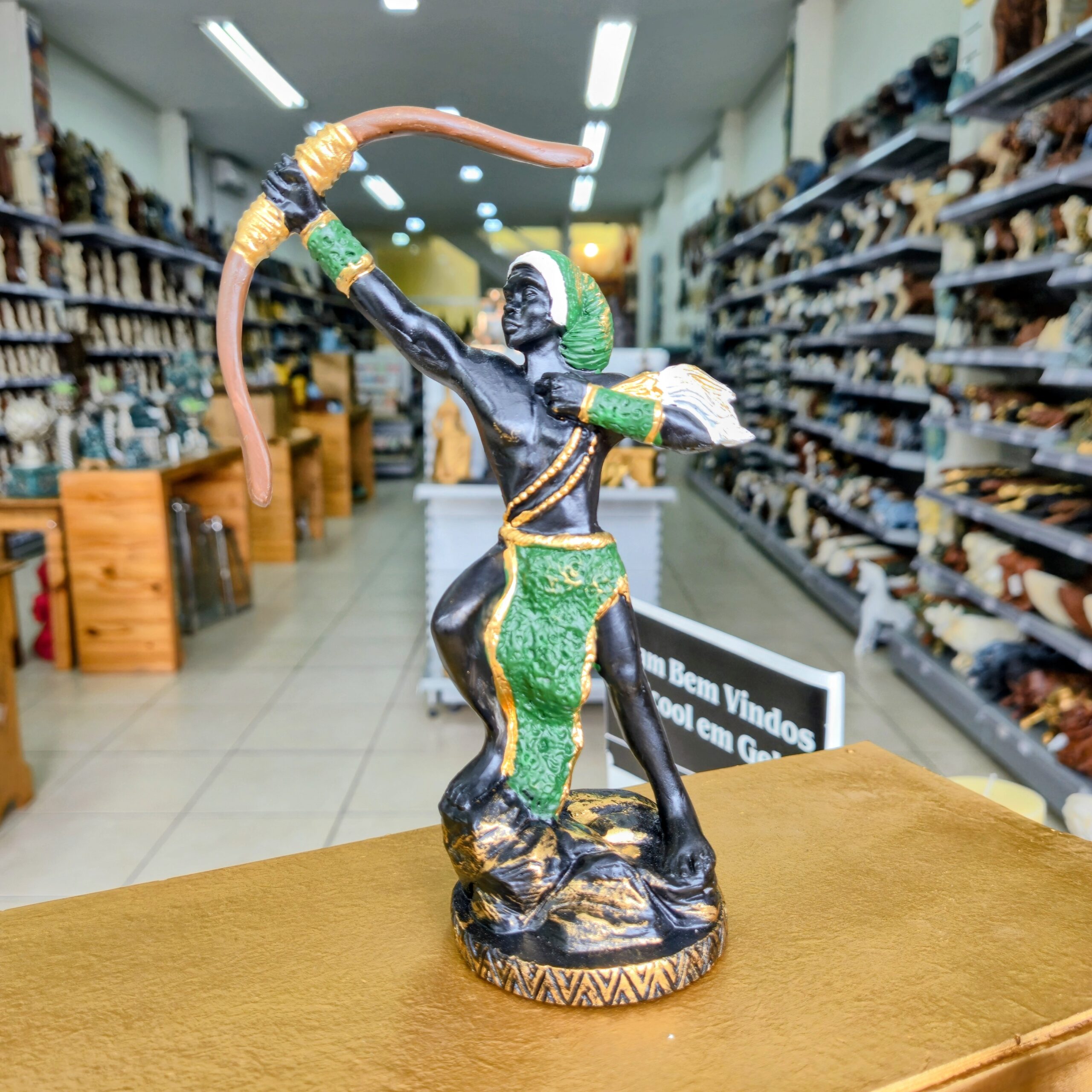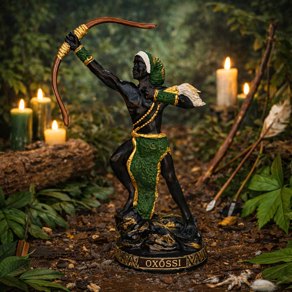 A imagem de Oxóssi representa o Orixá da caça, da fartura, da prosperidade e da sabedoria. Senhor das matas e do conhecimento, Oxóssi simboliza inteligência, estratégia, foco e abundância, sendo cultuado por aqueles que buscam crescimento material, proteção espiritual e equilíbrio com a natureza.