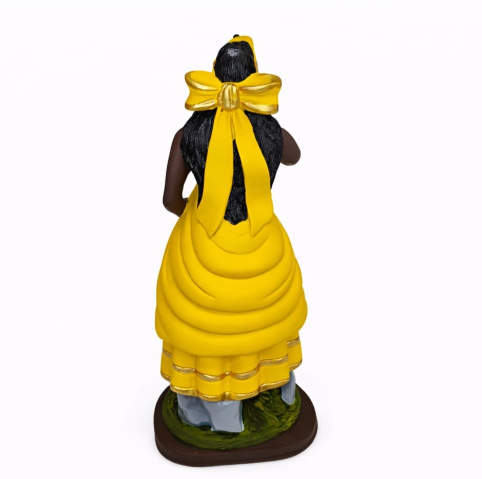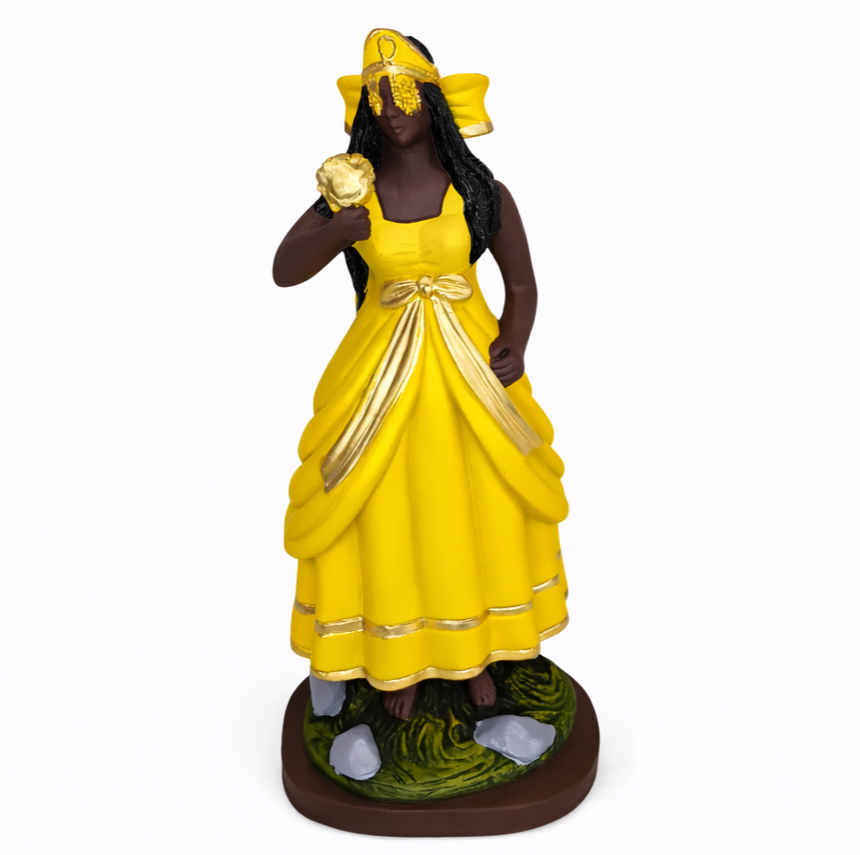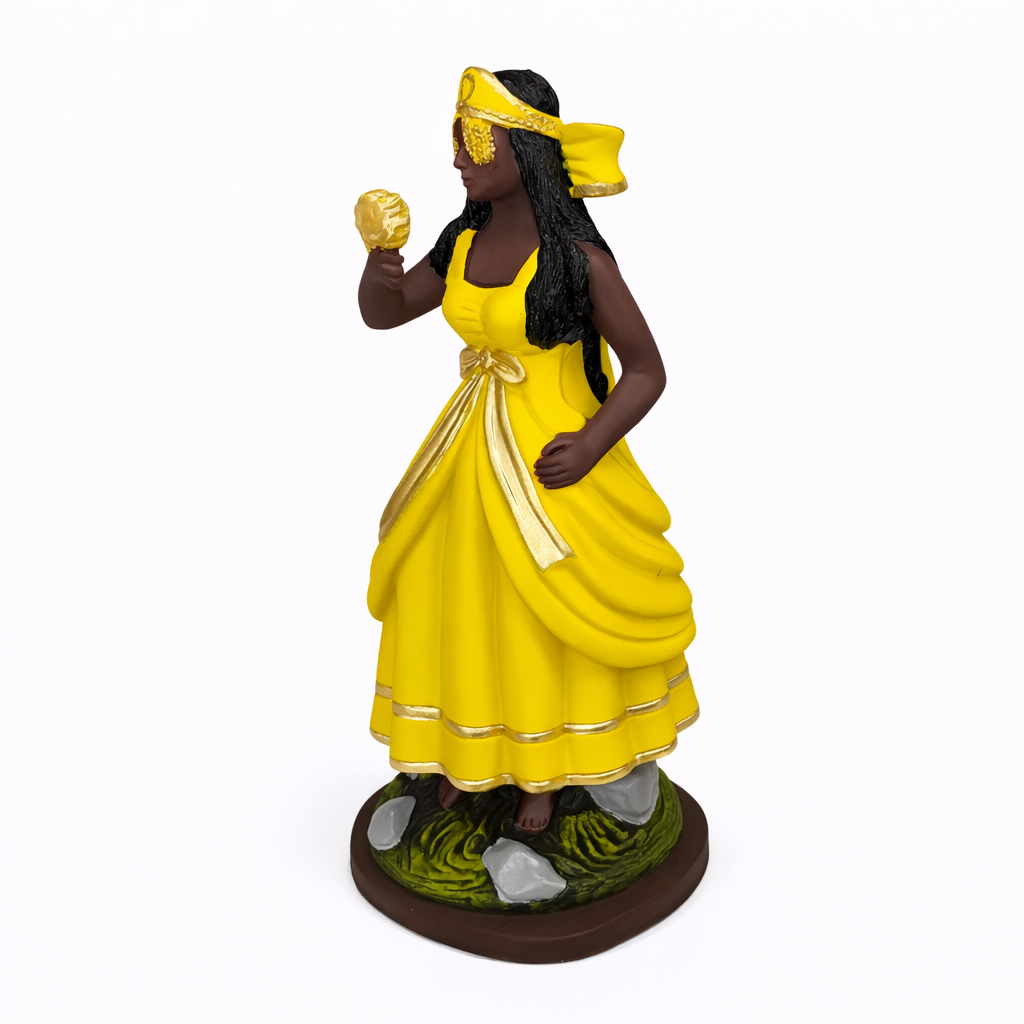 A imagem de Oxum representa o Orixá das águas doces, do amor, da fertilidade, da prosperidade e da beleza. Senhora dos rios e cachoeiras, Oxum simboliza sensibilidade, acolhimento, riqueza espiritual e material, sendo cultuada por trazer harmonia emocional, autoestima e abundância.