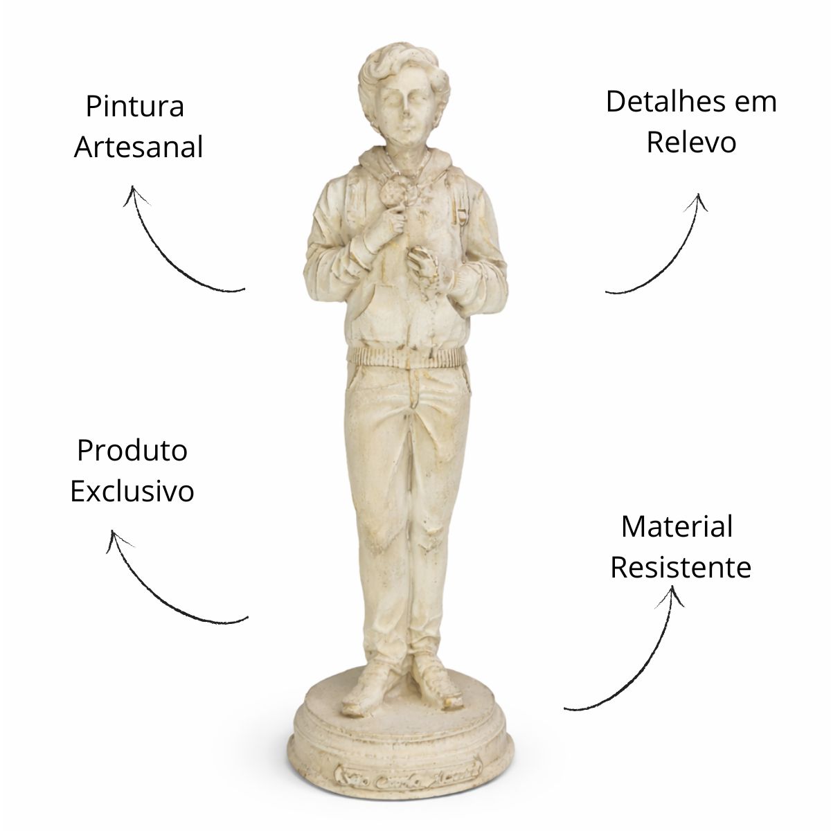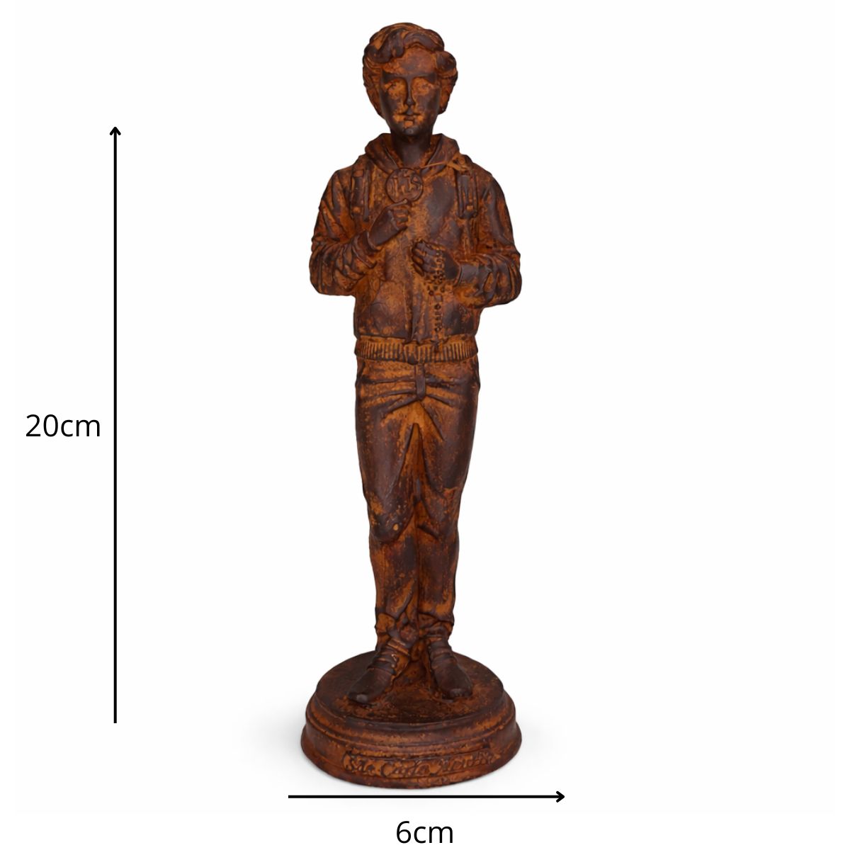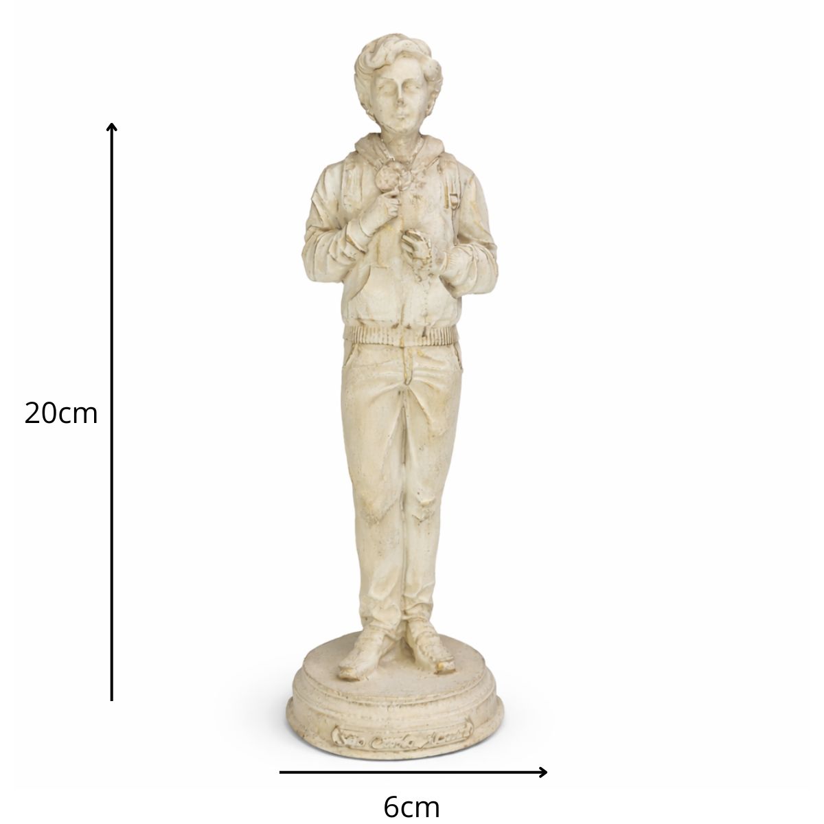 Com 20 cm de altura e 6 cm de largura, esta imagem é confeccionada em resina de alta qualidade, com pintura 100% artesanal que valoriza cada detalhe, transmitindo devoção e inspiração. Ideal para quem deseja fortalecer sua fé, especialmente no testemunho e exemplo de santidade de Carlo Acutis.