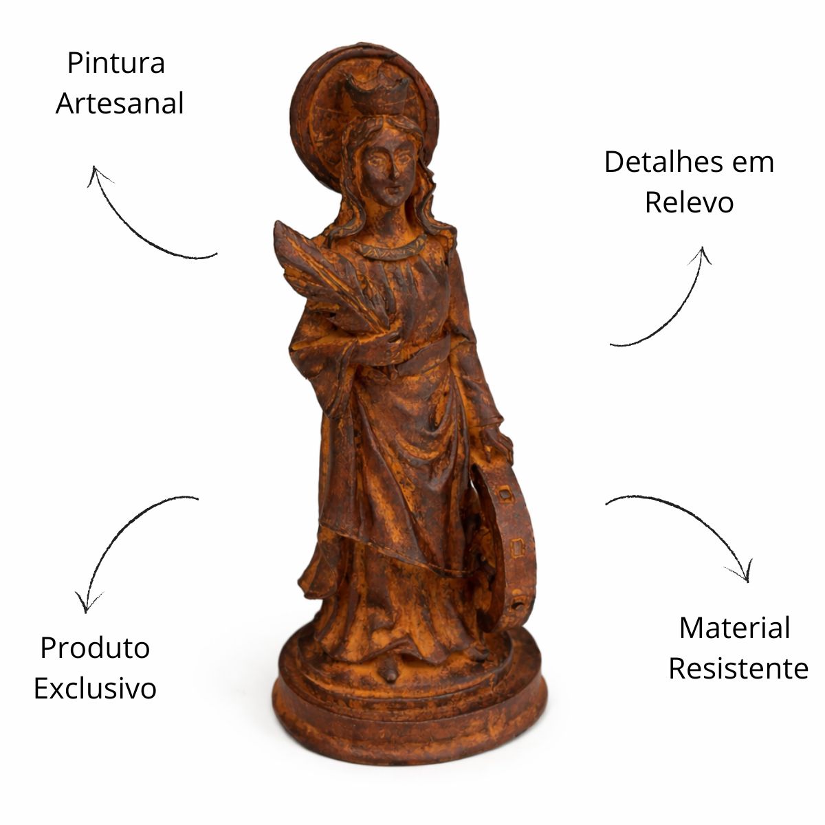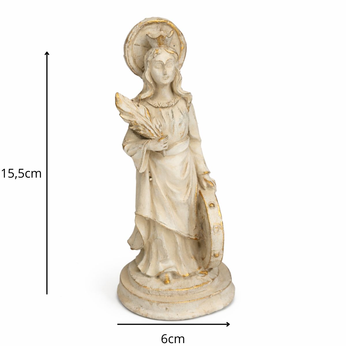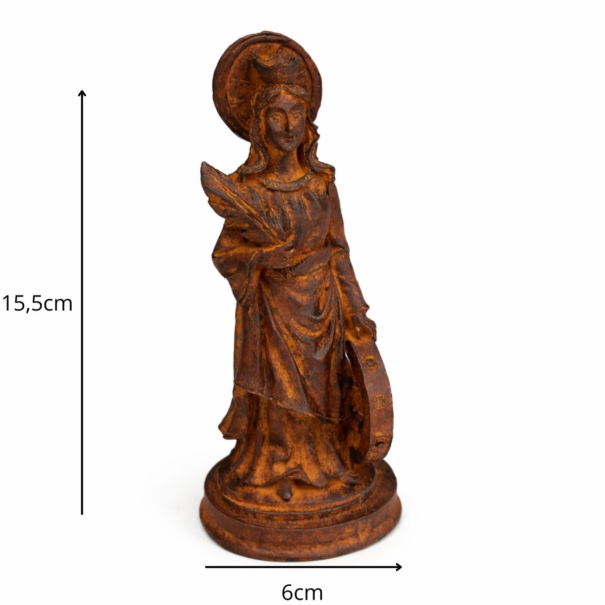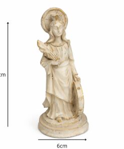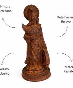 Com 15,5 cm de altura e 6 cm de largura, a peça é esculpida com delicadeza e riqueza de detalhes, refletindo a nobreza e a serenidade da santa, ideal para quem deseja fortalecer sua devoção e espiritualidade.