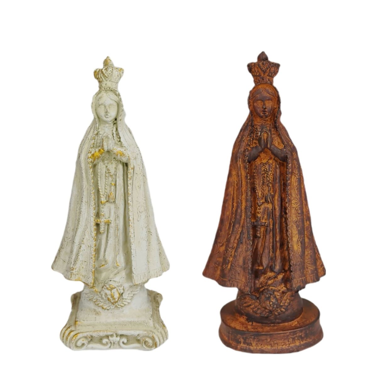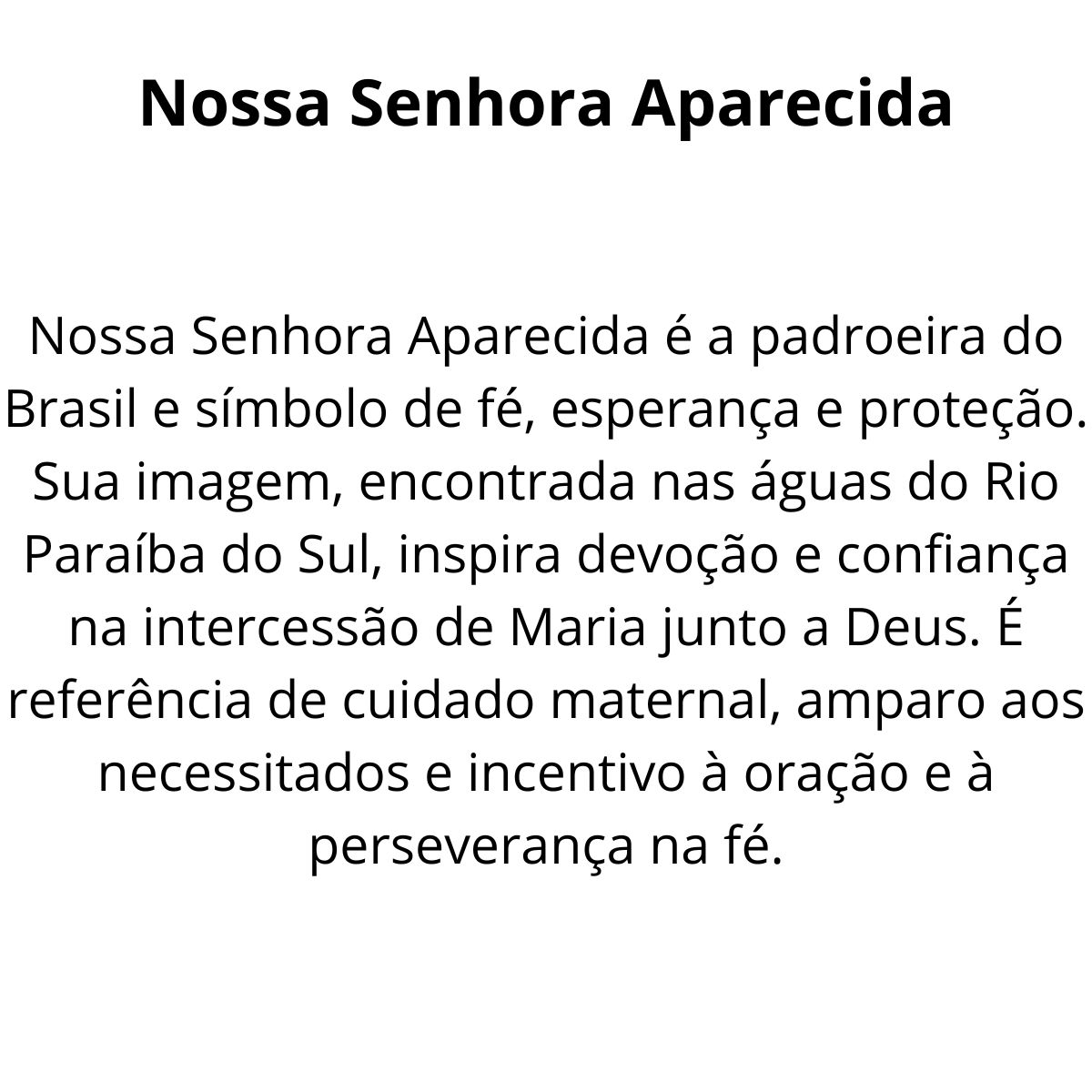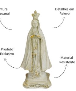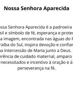 Nossa Senhora Aparecida, padroeira do Brasil, é a representação da Virgem Maria que, por meio de sua imagem encontrada nas águas do Rio Paraíba, se tornou símbolo de proteção, fé e intercessão para os brasileiros. Ela é venerada por milhões de devotos, especialmente por aqueles que buscam graça, saúde e paz em suas vidas. Esta imagem de Nossa Senhora Aparecida, feita em resina com pintura 100% artesanal, traz a devoção e a proteção dessa santa tão querida para o seu lar ou altar.