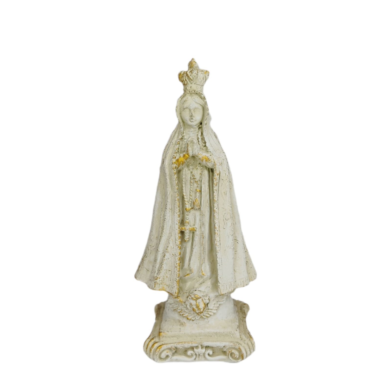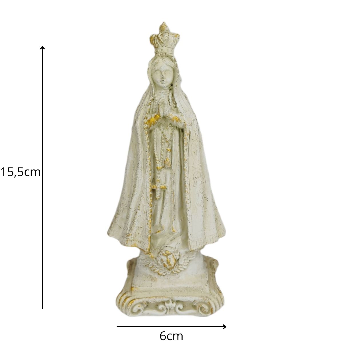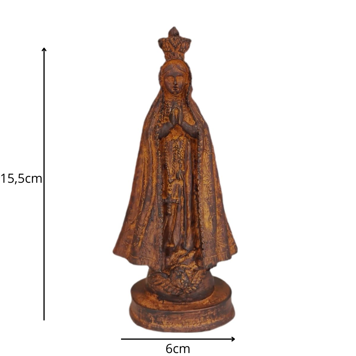 Com 15,5 cm de altura e 6 cm de largura, a peça é esculpida com detalhes que refletem a beleza e a força espiritual de Nossa Senhora Aparecida, sendo ideal para quem deseja fortalecer sua fé e confiança em sua intercessão.