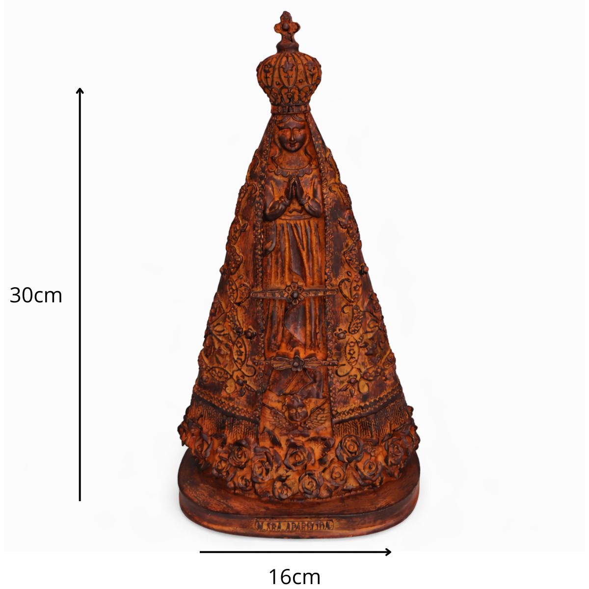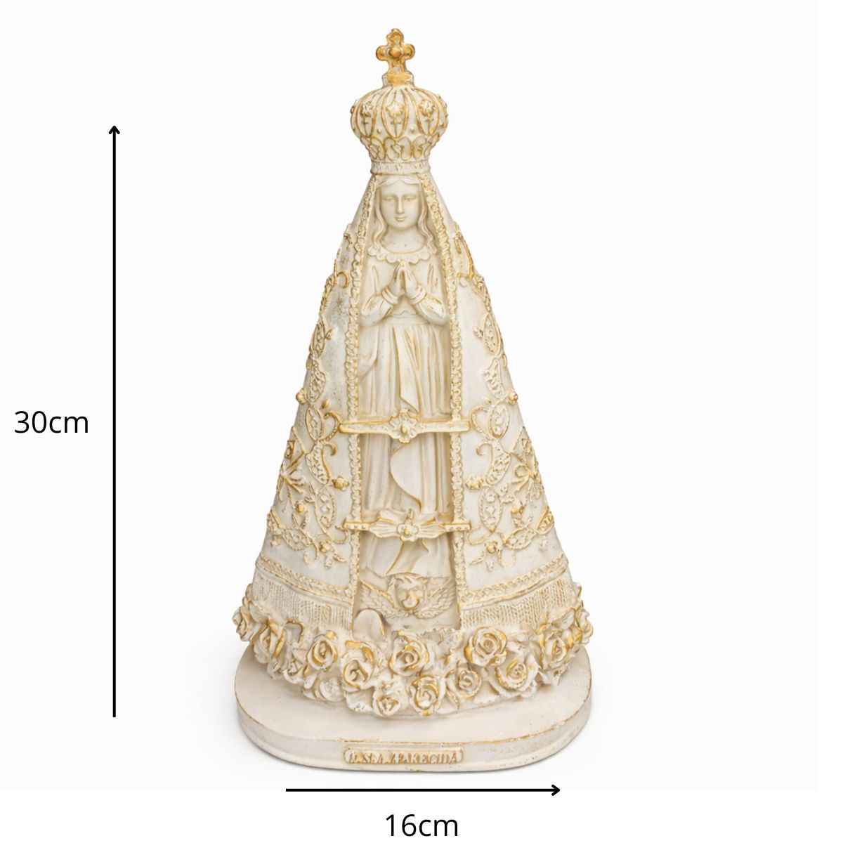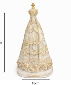 Com 30 cm de altura e 16 cm de largura, a peça é cuidadosamente esculpida, destacando o manto azul estrelado e os detalhes que fazem dela um ícone de fé. Ideal para quem busca fortalecer sua ligação com Maria e sentir sua constante intercessão.
