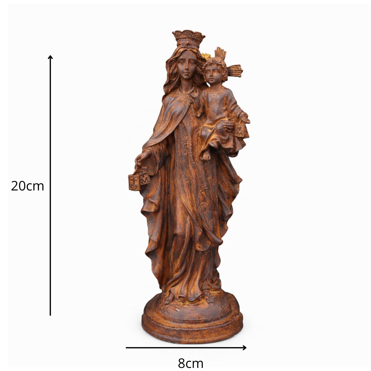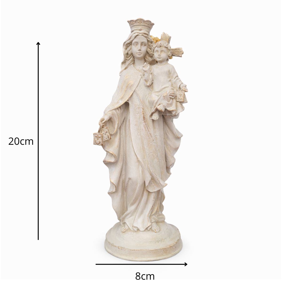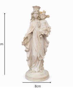 Com 20 cm de altura e 8 cm de largura, esta peça é feita em resina de alta qualidade, com pintura 100% artesanal, destacando os ricos detalhes do manto e do Menino Jesus em seus braços. Ideal para quem deseja fortalecer sua fé ou presentear com um símbolo de amor e proteção.