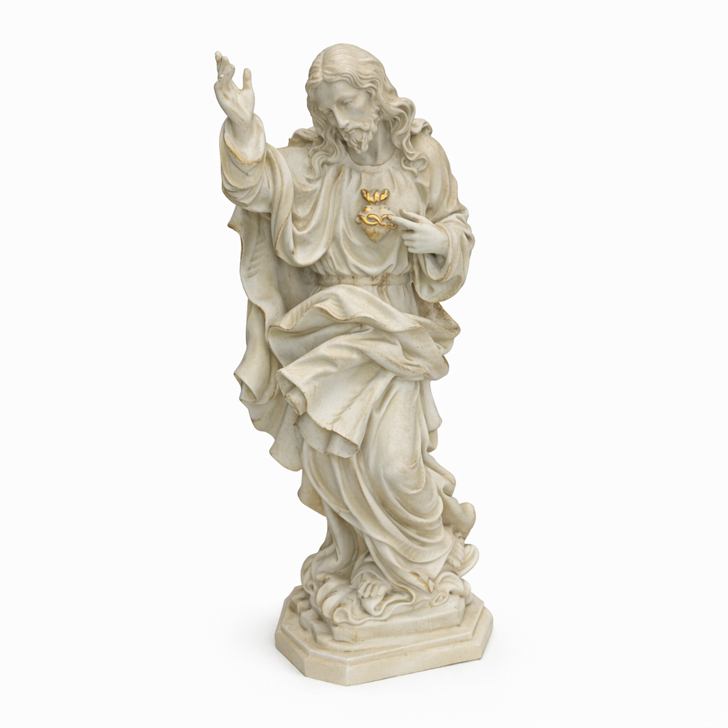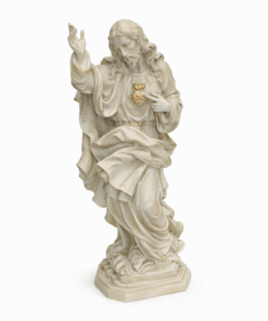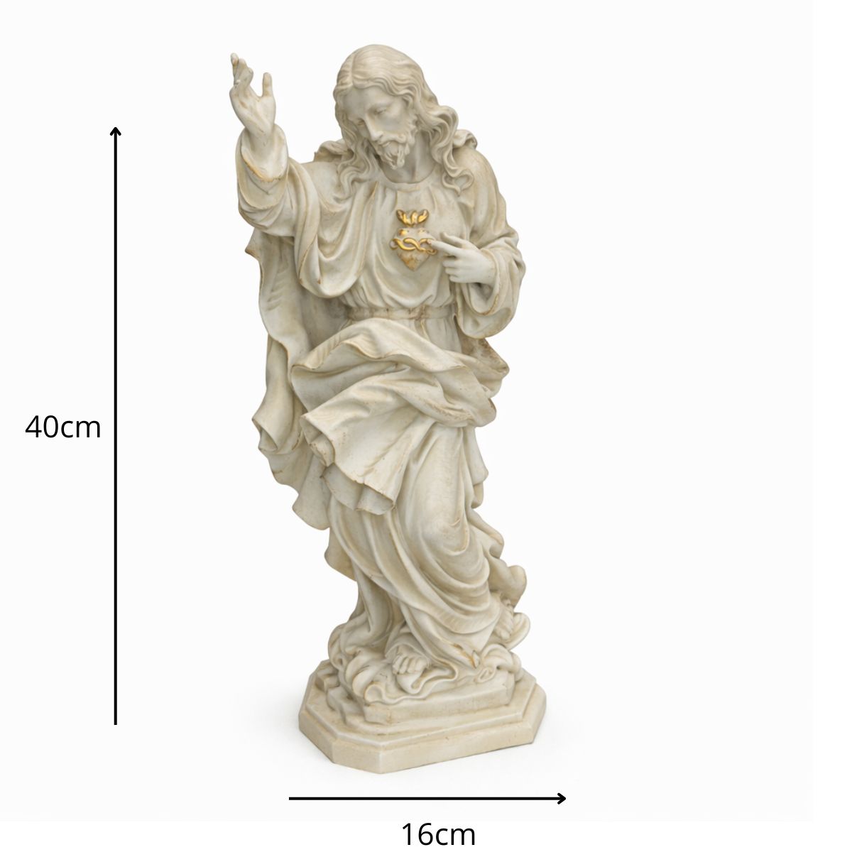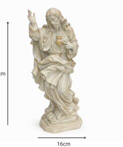 Com 40 cm de altura e 16 cm de largura, a peça é esculpida com riqueza de detalhes, refletindo a compaixão e majestade do Sagrado Coração, sendo ideal para aqueles que desejam fortalecer sua fé e devoção.