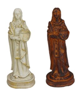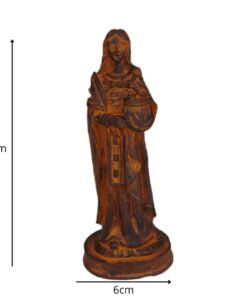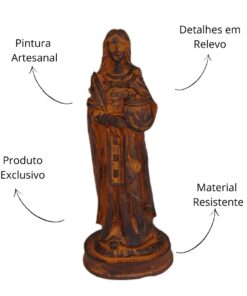 Com 15 cm de altura e 6 cm de largura, a peça é esculpida com detalhes que refletem a firmeza e a serenidade da santa, sendo ideal para quem deseja fortalecer sua fé e devoção.