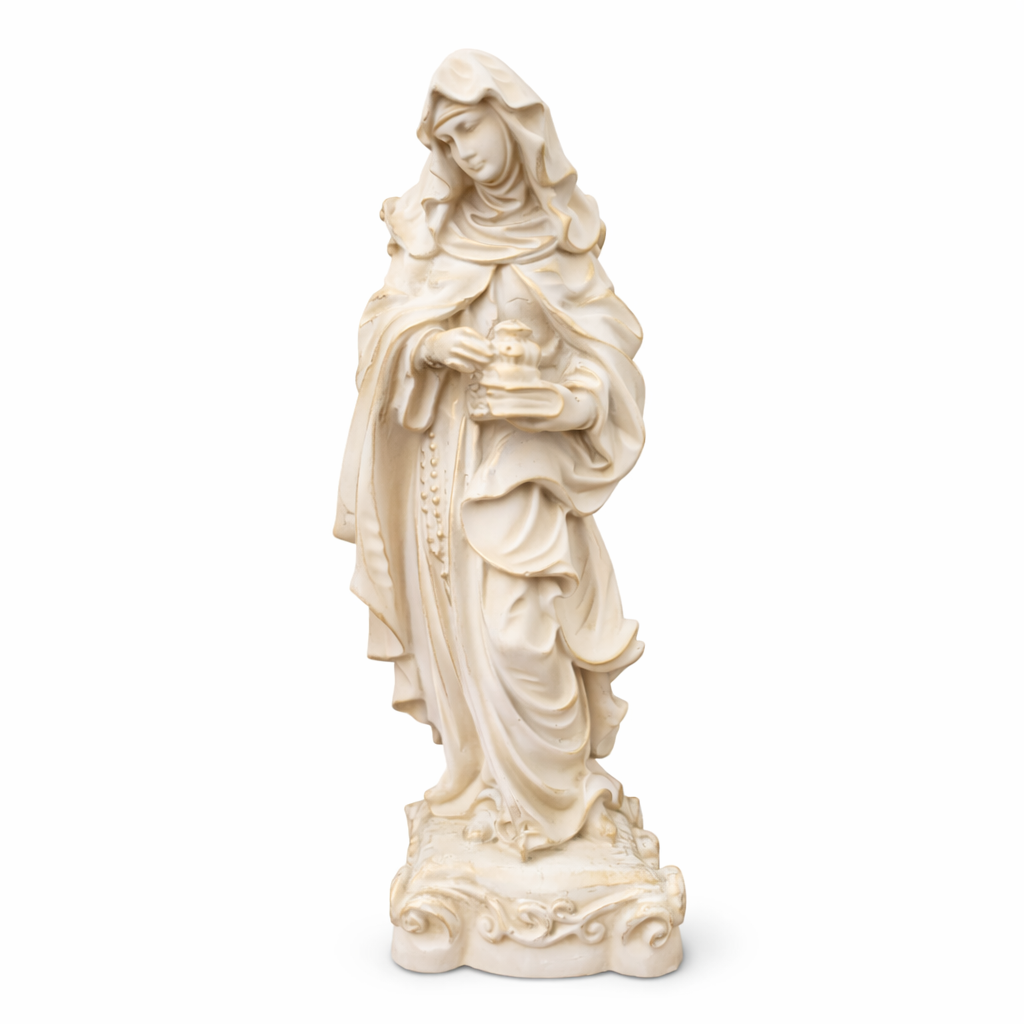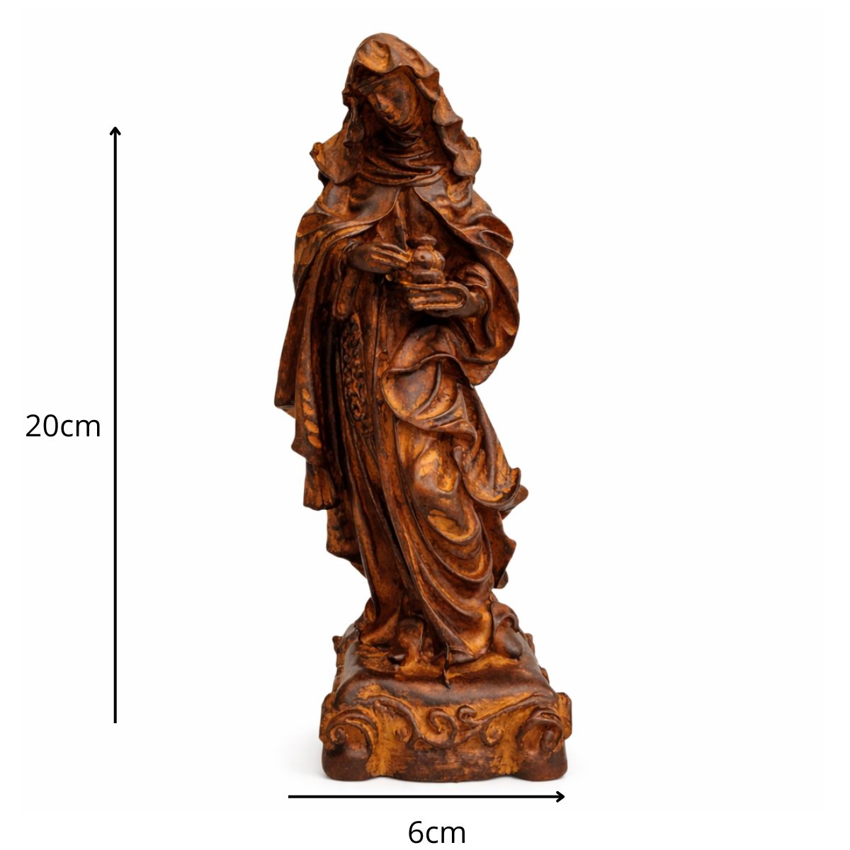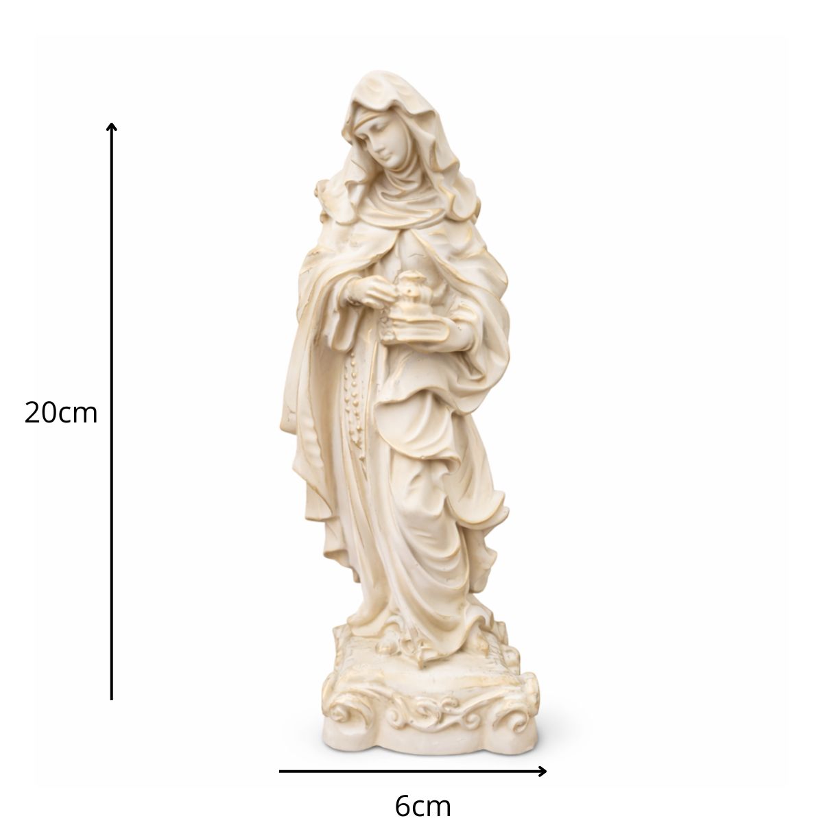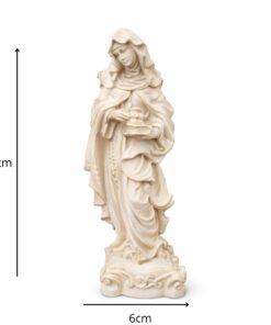 Com 20 cm de altura e 6 cm de largura, esta imagem é produzida em resina de alta qualidade, com pintura 100% artesanal, evidenciando os detalhes do hábito religioso e a expressão serena da santa. Ideal para quem busca conforto espiritual ou deseja presentear com fé e esperança.