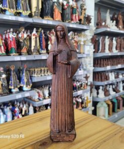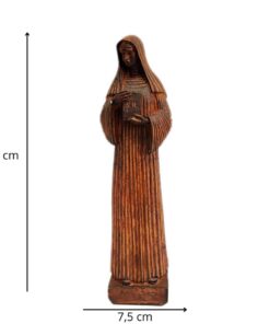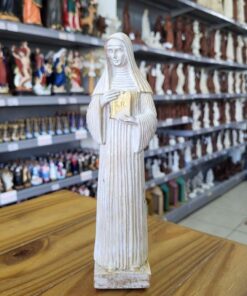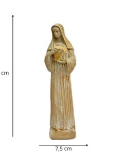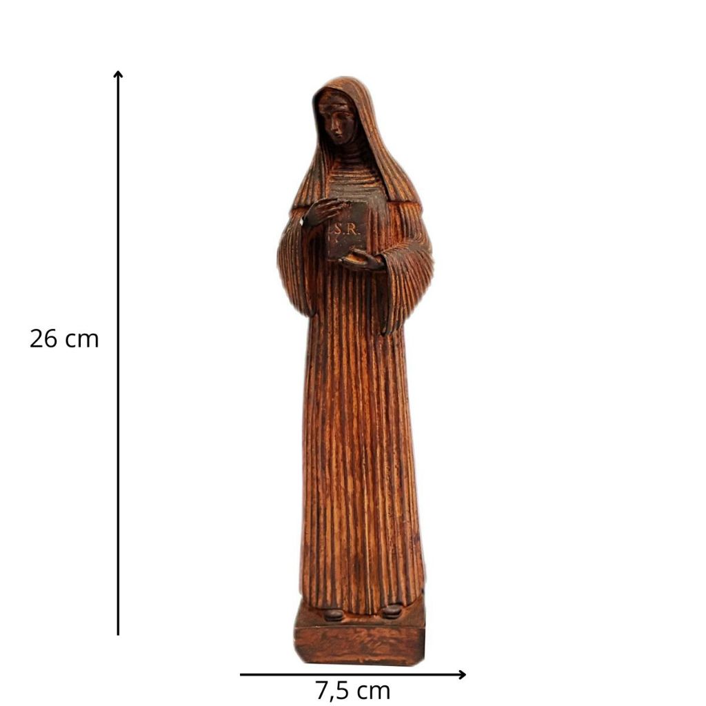 Com 26 cm de altura e 7,5 cm de largura, a peça é feita com detalhes refinados que refletem a simplicidade e a profundidade espiritual de Santa Escolástica, sendo ideal para quem deseja fortalecer a fé e a espiritualidade no dia a dia.