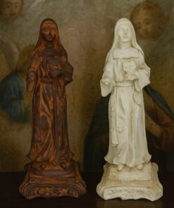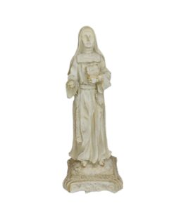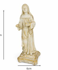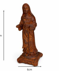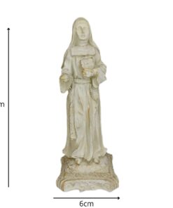 Com 15 cm de altura e 6 cm de largura, a peça é esculpida com delicadeza e riqueza de detalhes que expressam a serenidade e o amor ao próximo característicos da santa. Ideal para quem deseja fortalecer sua fé e seguir seu exemplo de entrega e bondade.