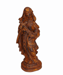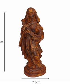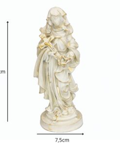 Com 20 cm de altura e 7,5 cm de largura, esta imagem é feita em resina de alta qualidade, com pintura 100% artesanal, destacando os traços serenos e os símbolos de sua santidade, como o crucifixo e a coroa de espinhos. Ideal para oratórios, altares ou como presente de fé e confiança.
