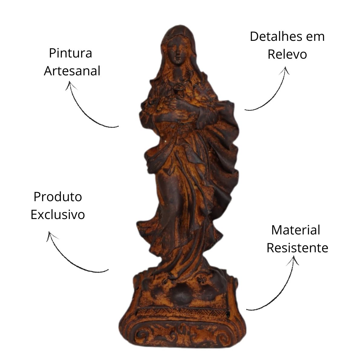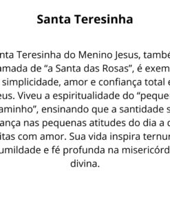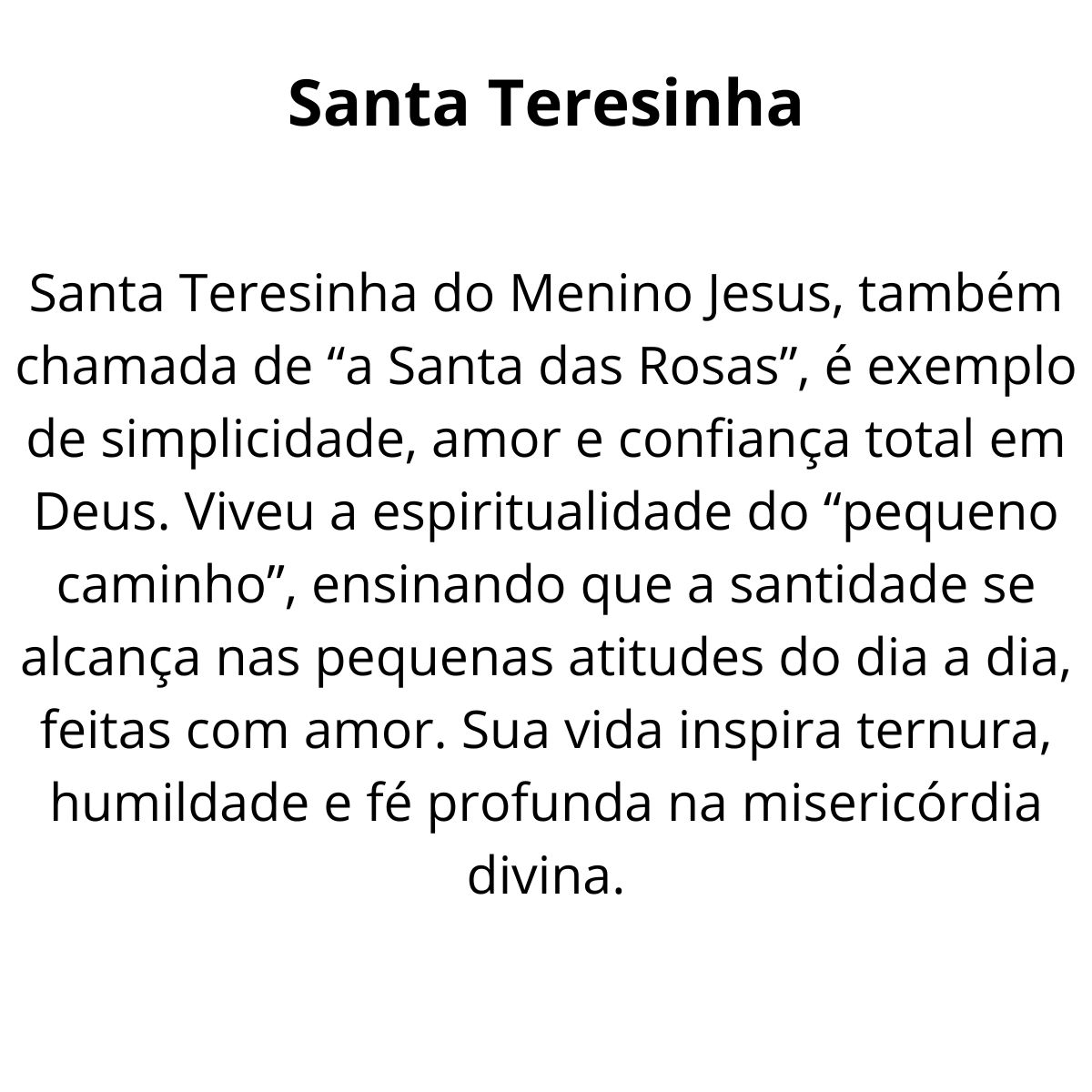 Santa Teresinha do Menino Jesus é conhecida como a “Santa das Rosas” e exemplo de simplicidade, amor e confiança em Deus. Com seu caminho espiritual baseado nas pequenas ações feitas com grande amor, ela ensina que a santidade está nas atitudes cotidianas e na entrega total ao Senhor. Sua imagem inspira fé, pureza e doçura, sendo muito venerada pelos devotos que buscam esperança e intercessão. Esta imagem, feita em resina com pintura 100% artesanal, leva a presença serena e amorosa de Santa Teresinha para o seu lar, altar ou local de oração.