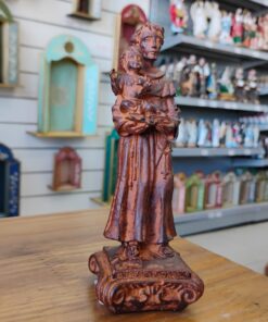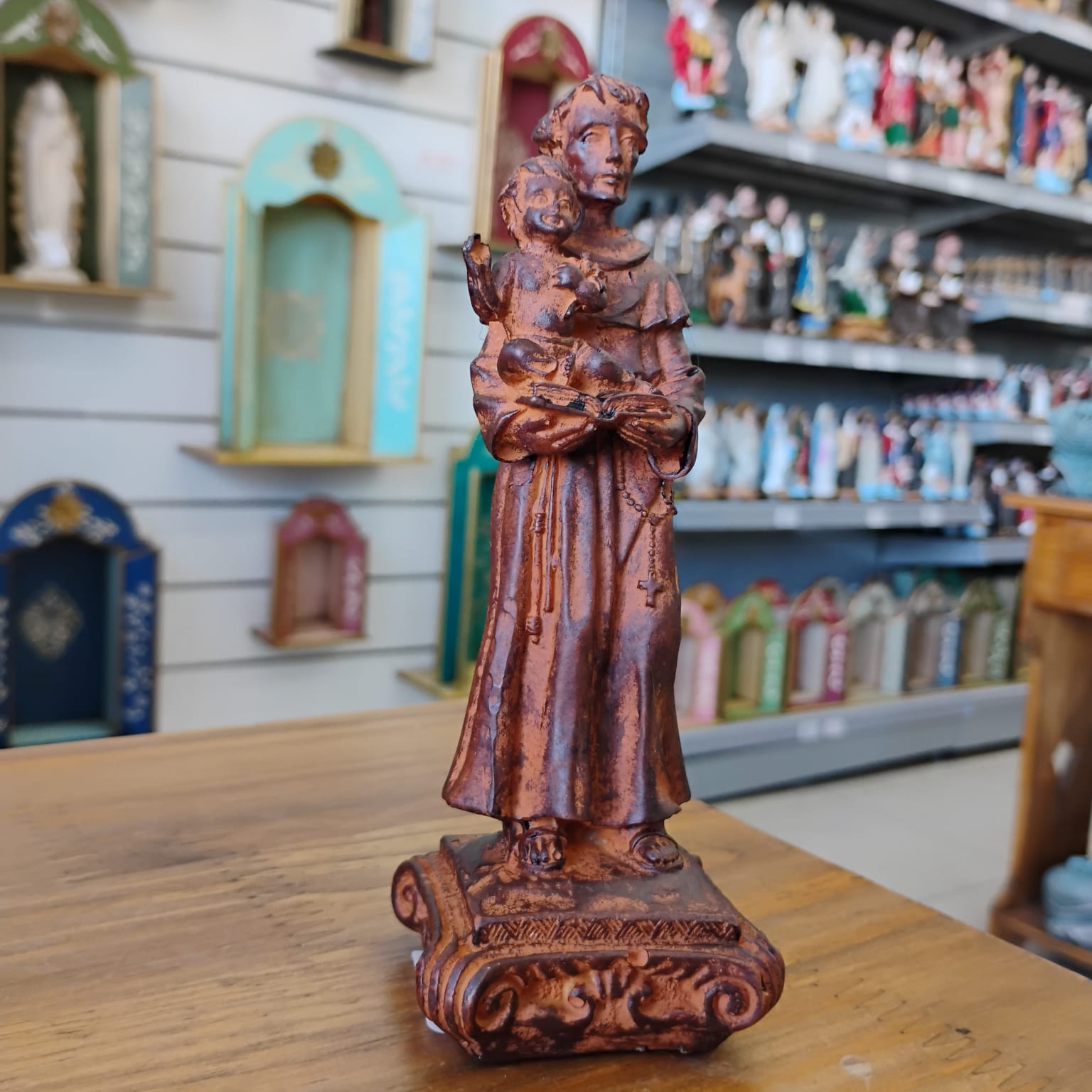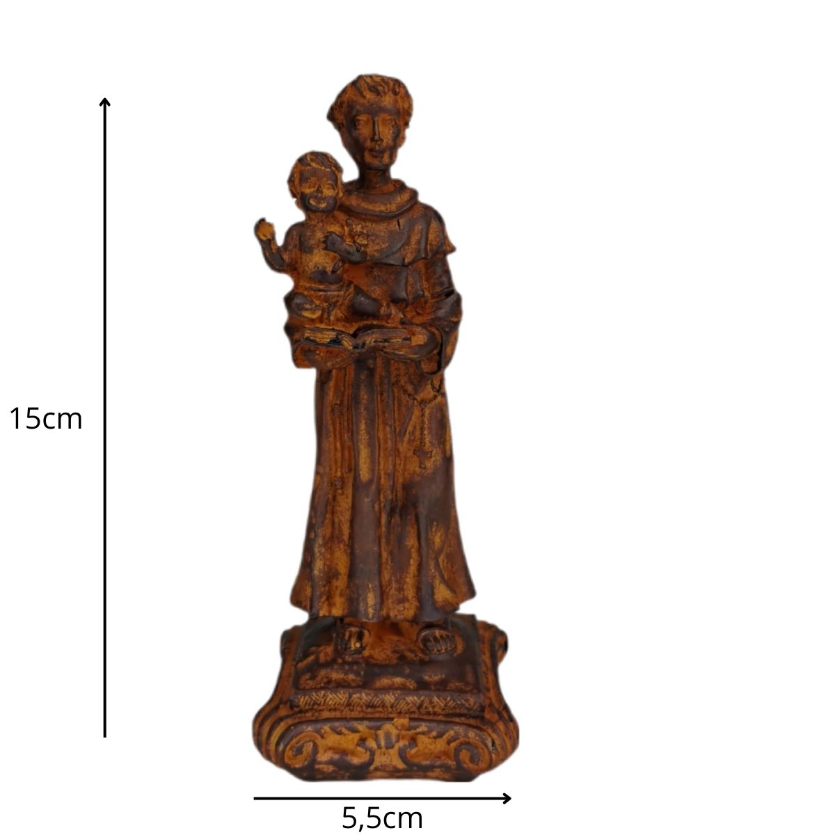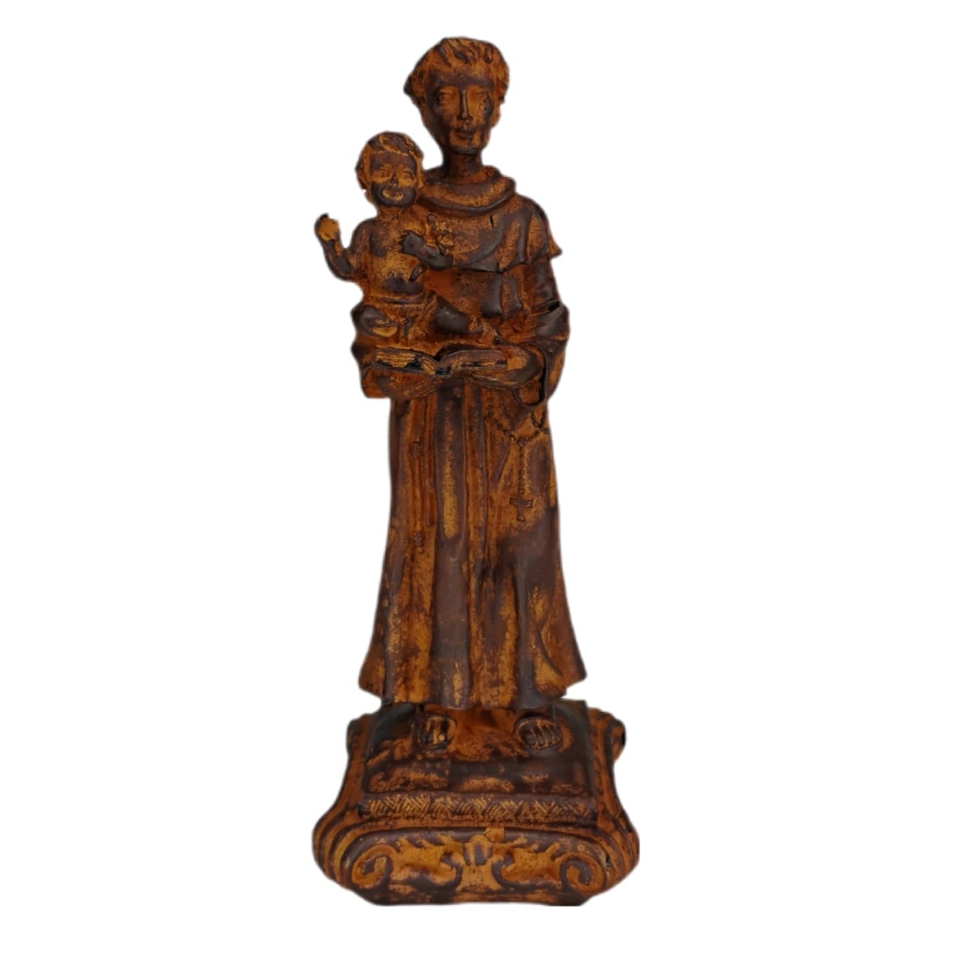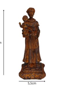 Com 15 cm de altura e 5,5 cm de largura, a peça é esculpida com riqueza de detalhes, retratando Santo Antônio com o Menino Jesus nos braços — um gesto que simboliza ternura, fé e entrega a Deus.