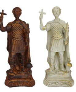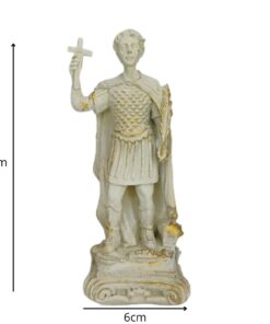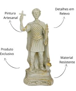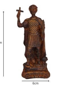 Com 16 cm de altura e 6 cm de largura, a peça é esculpida com riqueza de detalhes que retratam o santo como um guerreiro da fé, segurando a cruz com a palavra “HODIE” (hoje), símbolo de prontidão para servir a Deus. Ideal para quem busca coragem, fé e proteção em momentos decisivos.