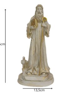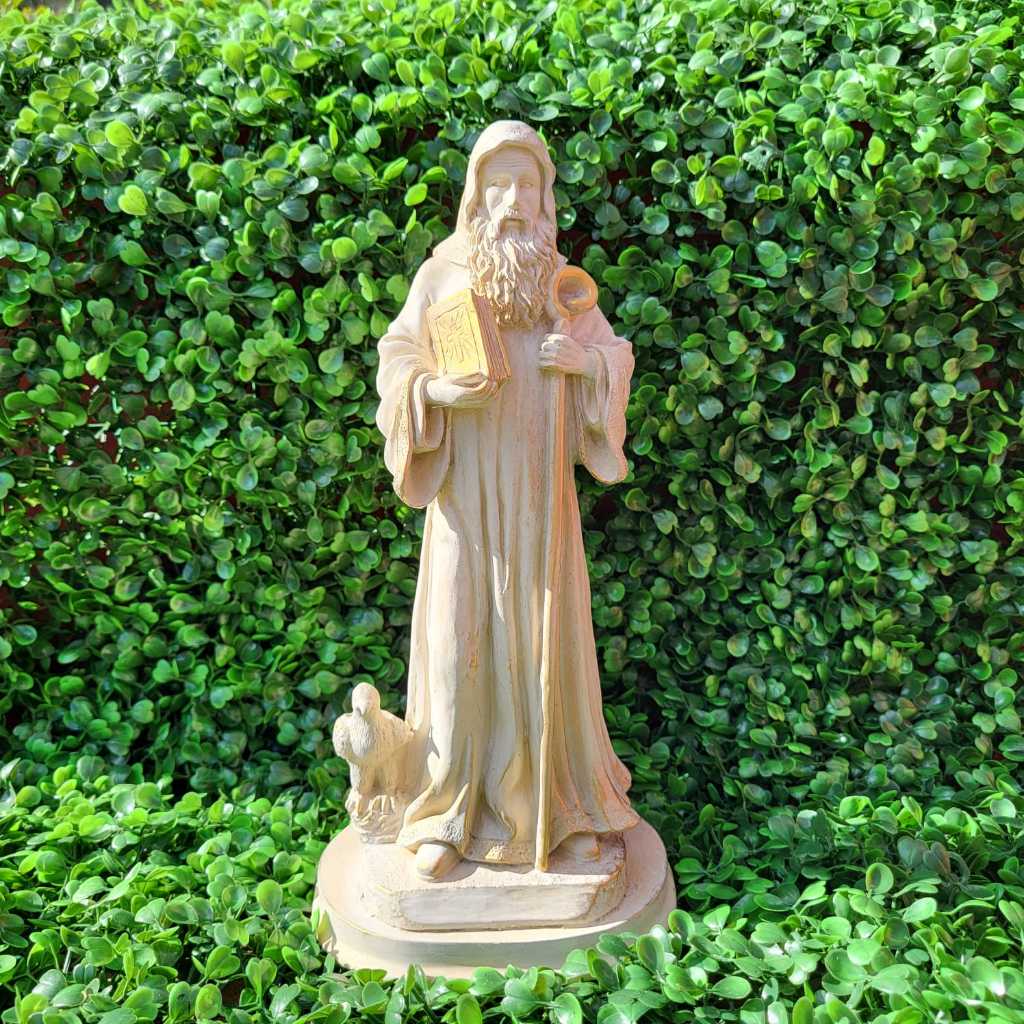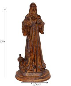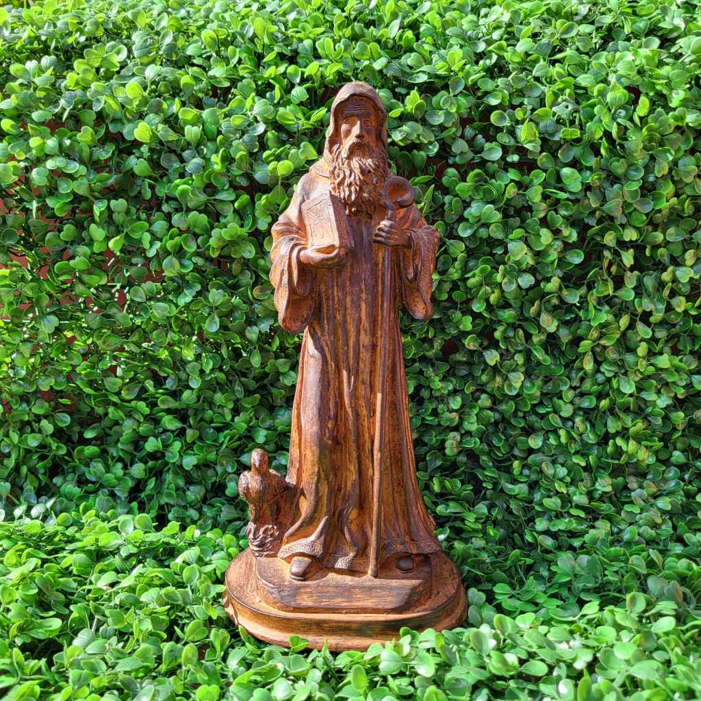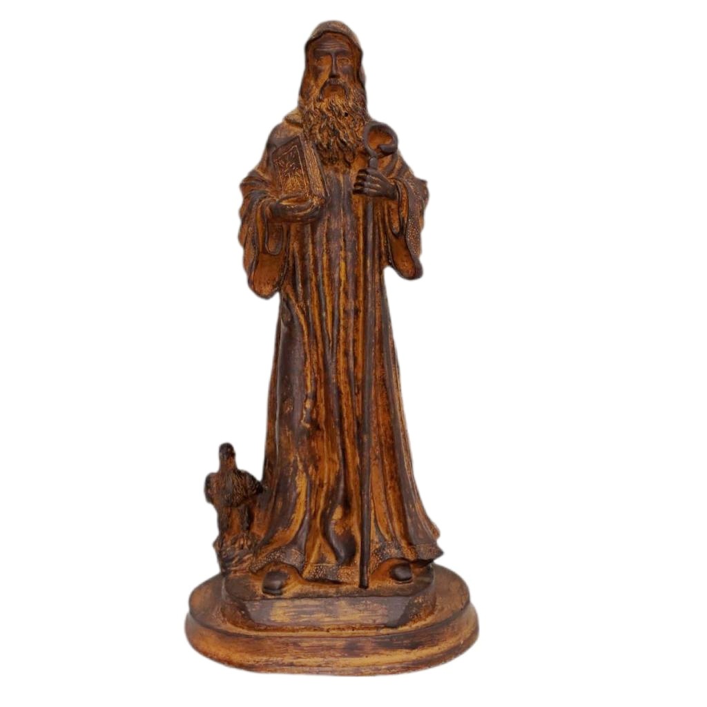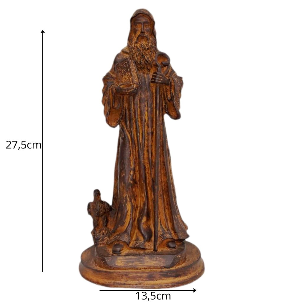 Com 27,5 cm de altura e 13,5 cm de largura, a peça é cuidadosamente esculpida para refletir a força espiritual e a proteção que São Bento oferece a todos que buscam viver com fé e confiança em Deus.