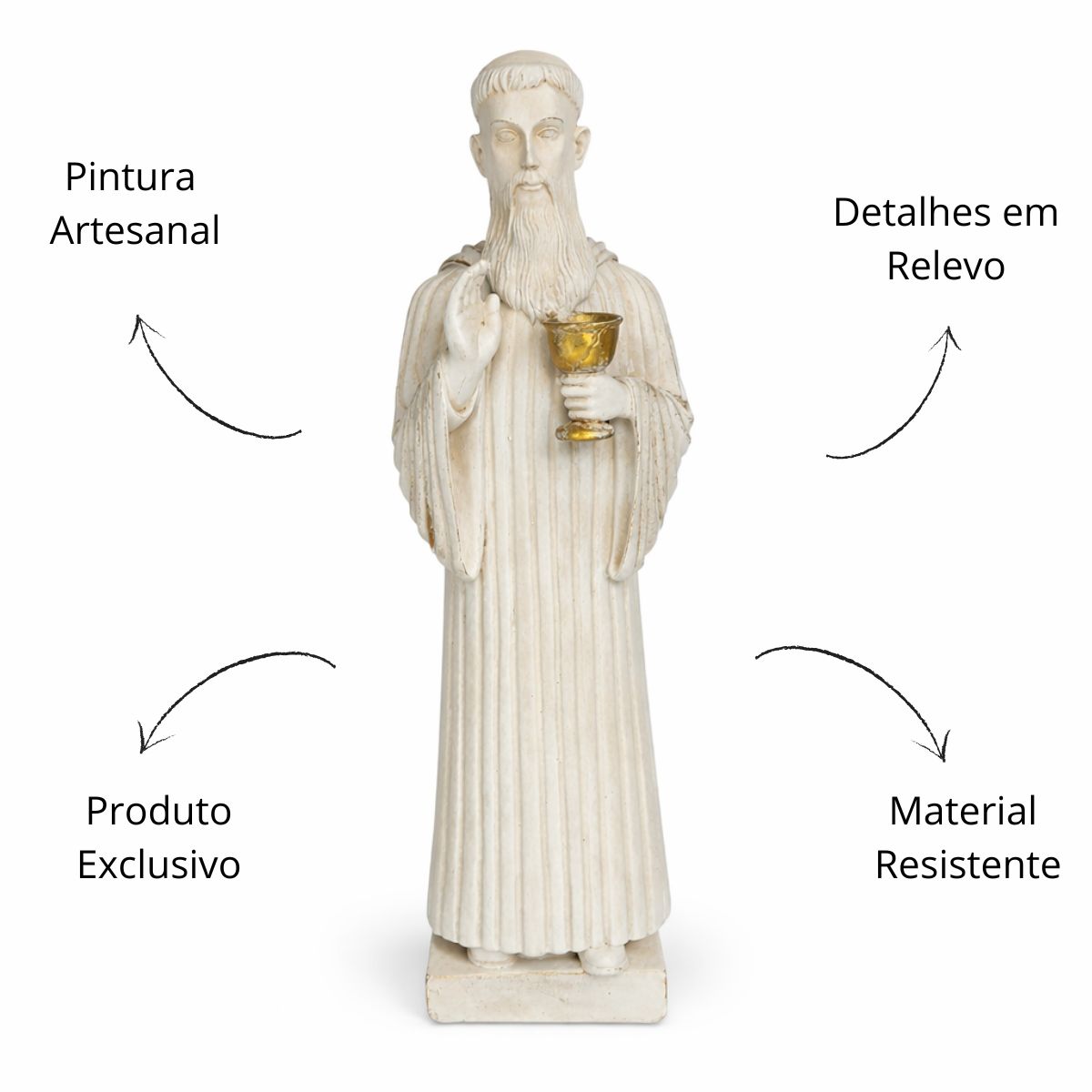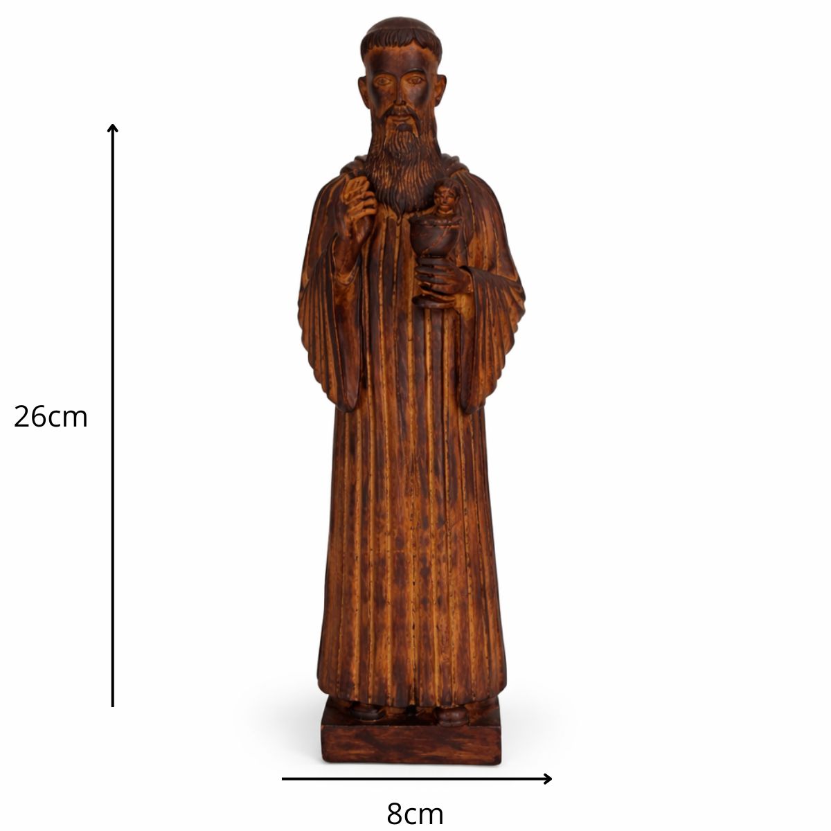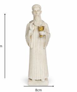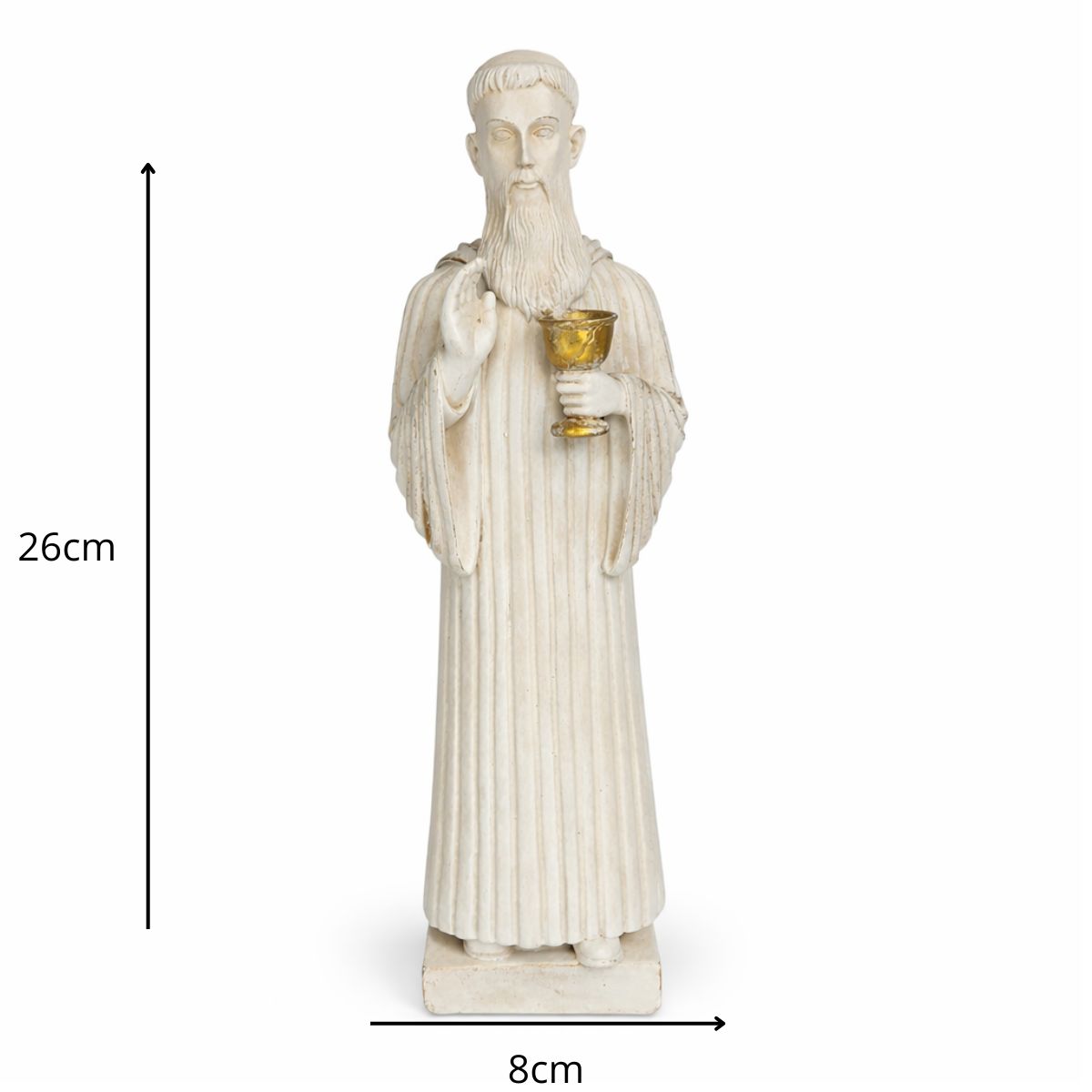Com 26 cm de altura e 8 cm de largura, a peça é cuidadosamente esculpida para refletir a força espiritual e a proteção que São Bento oferece a todos que buscam viver com fé e confiança em Deus.