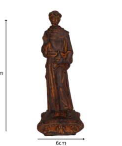 Com 16 cm de altura e 6 cm de largura, a peça é perfeita para compor altares, oratórios ou espaços de oração, sendo também uma bela opção de presente para devotos e amantes dos animais.