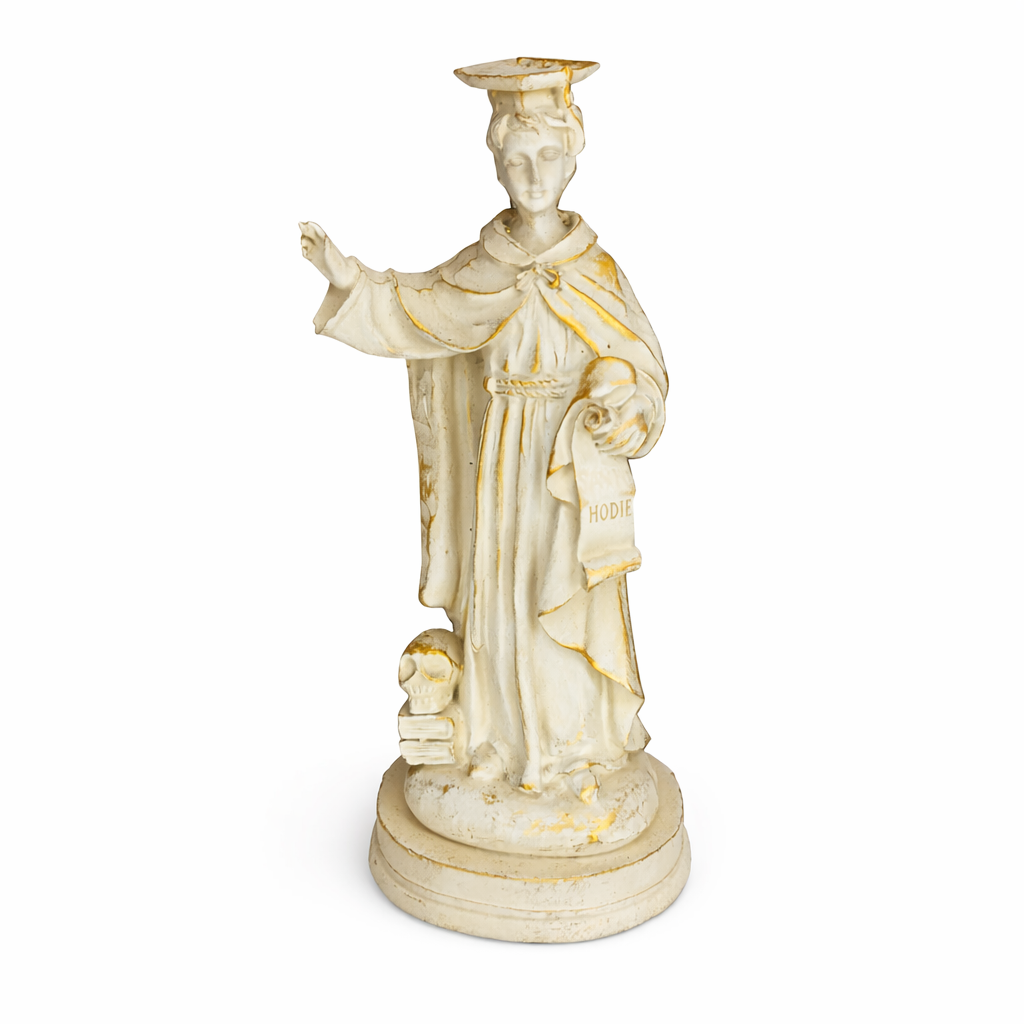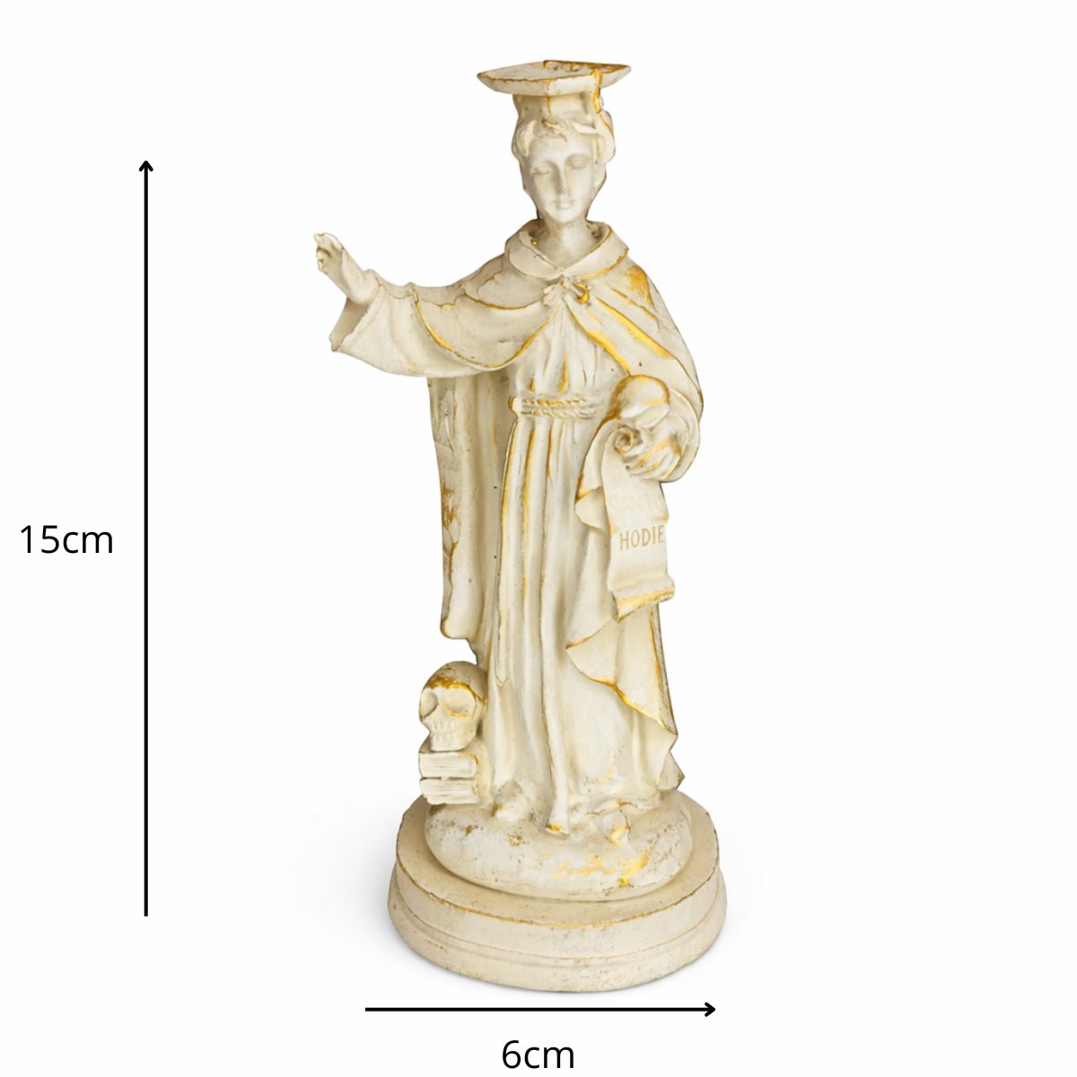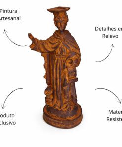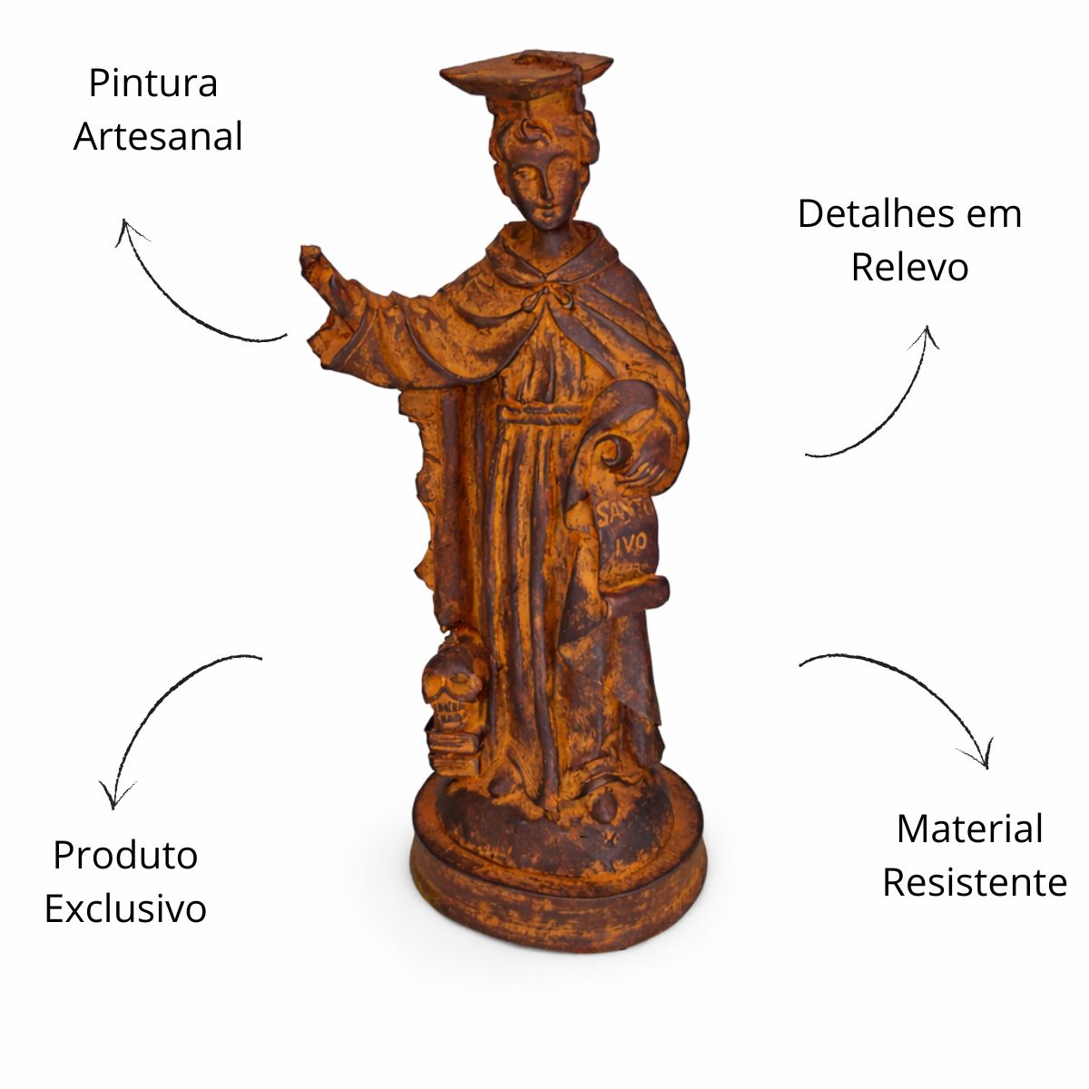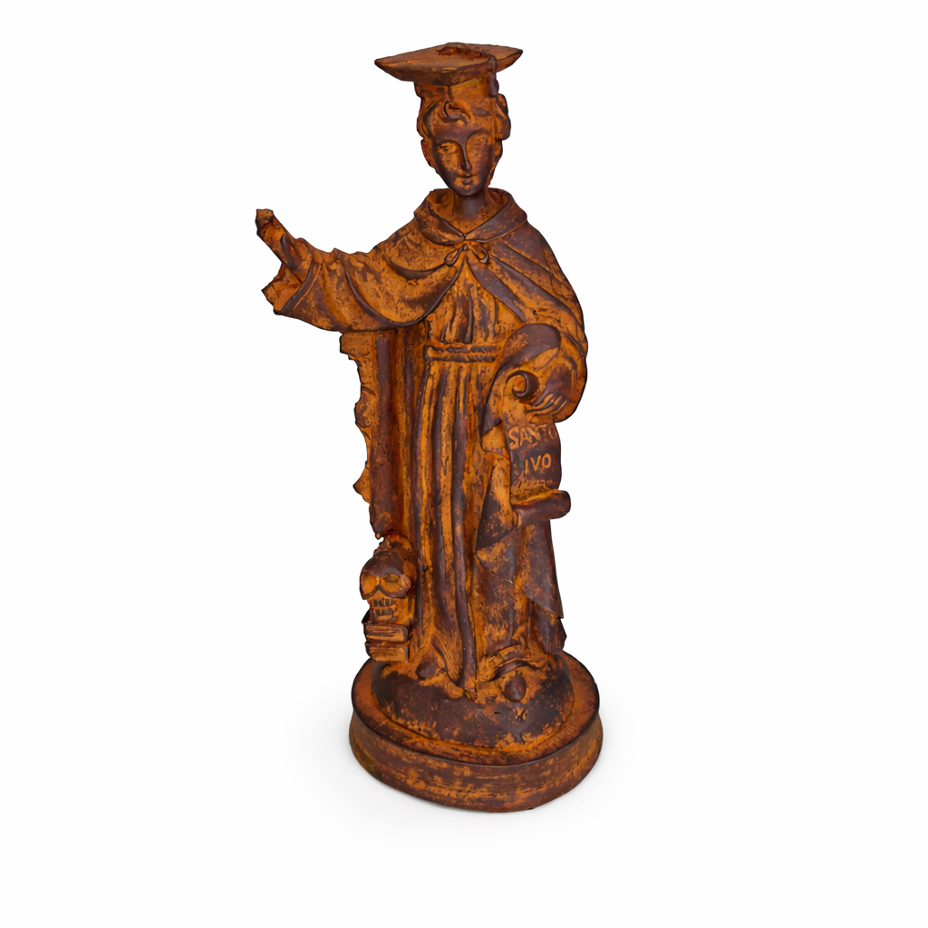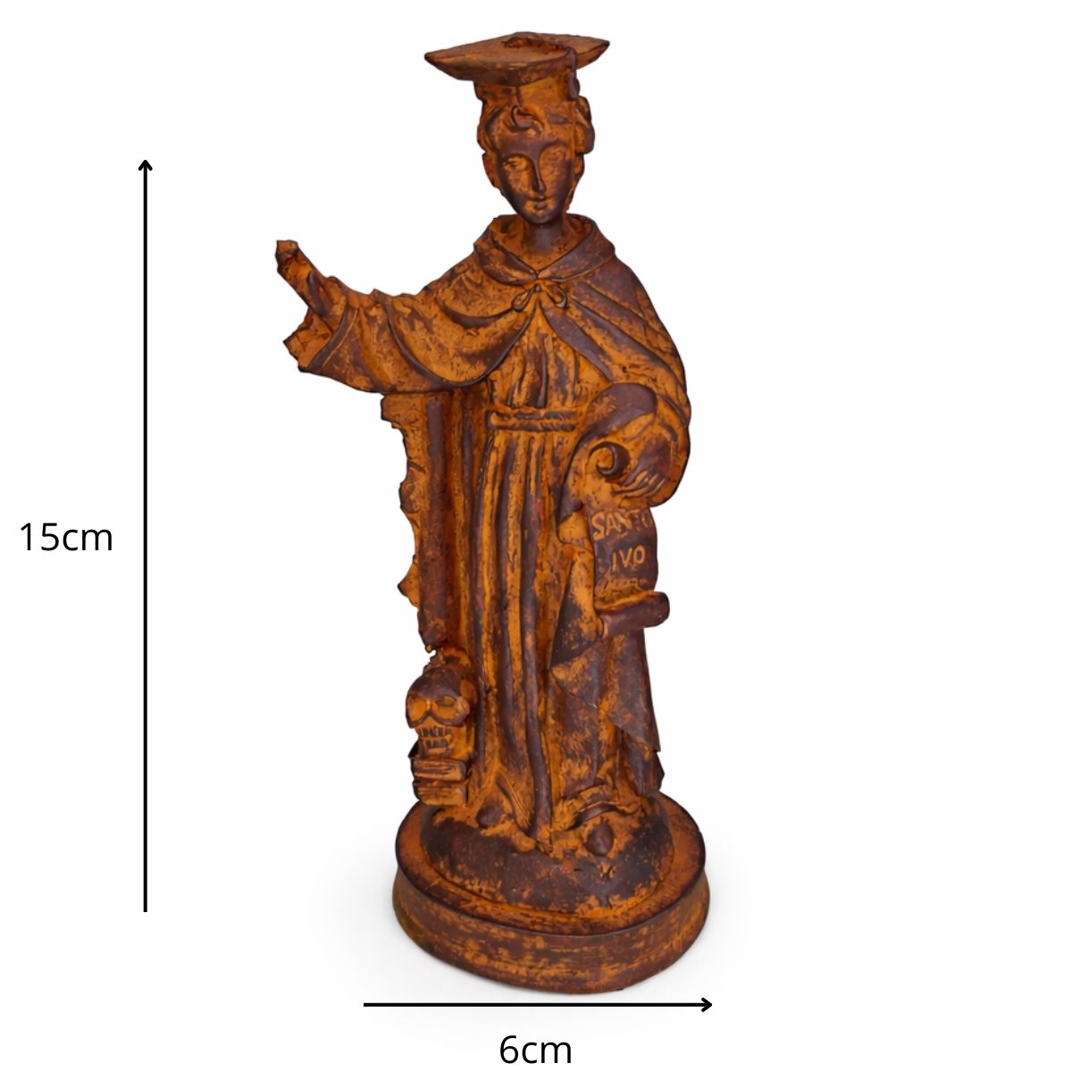 Com 15 cm de altura e 6 cm de largura, a peça é ricamente trabalhada, destacando os traços de devoção e virtude que representam a missão de São Ivo em promover o bem e a equidade.