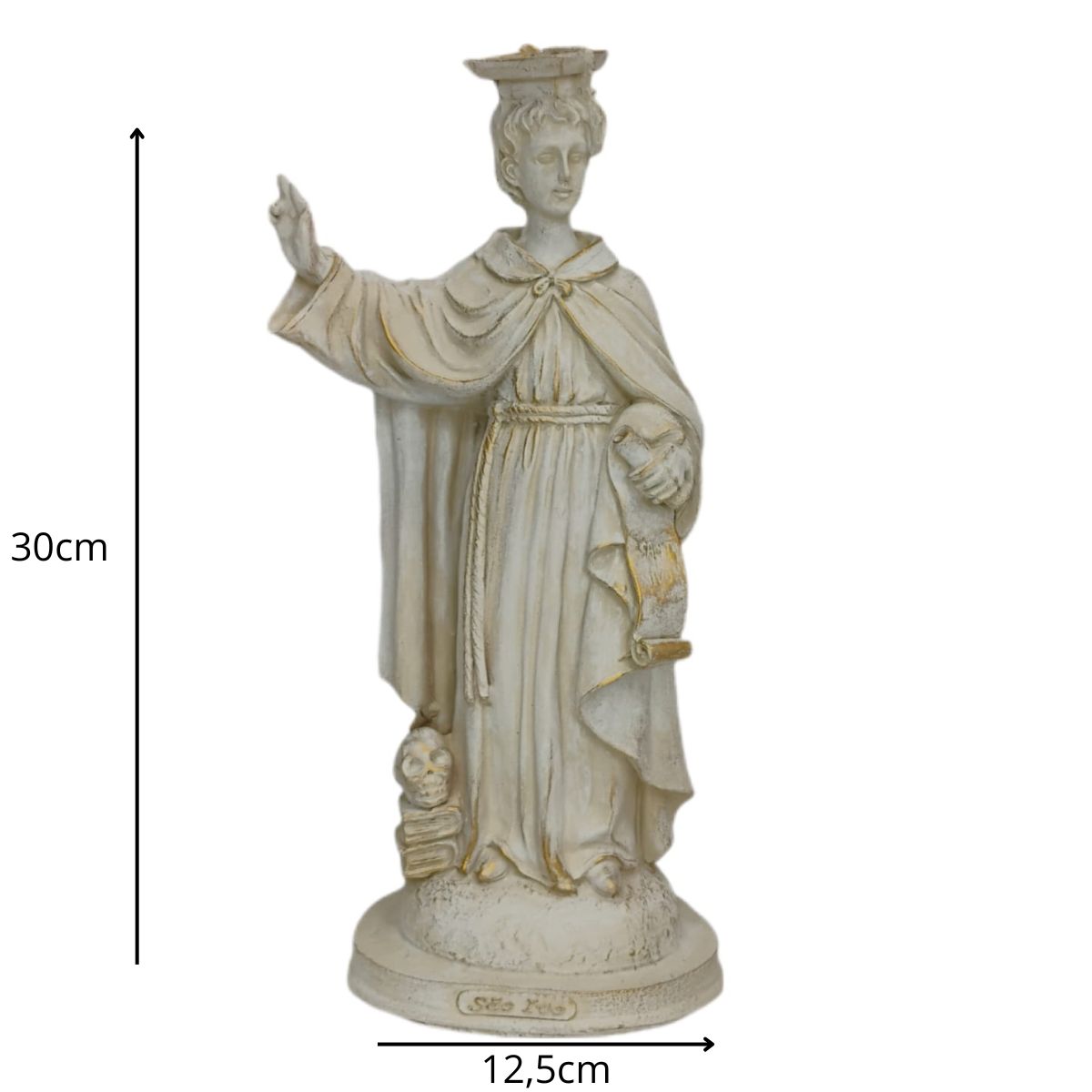 Com 30,5 cm de altura e 12 cm de largura, esta imagem é feita em resina de alta qualidade, com pintura 100% artesanal, evidenciando os detalhes finos e o semblante sereno de São Ivo. Uma peça especial para quem deseja fortalecer sua fé, buscar inspiração em sua missão ou presentear com devoção.