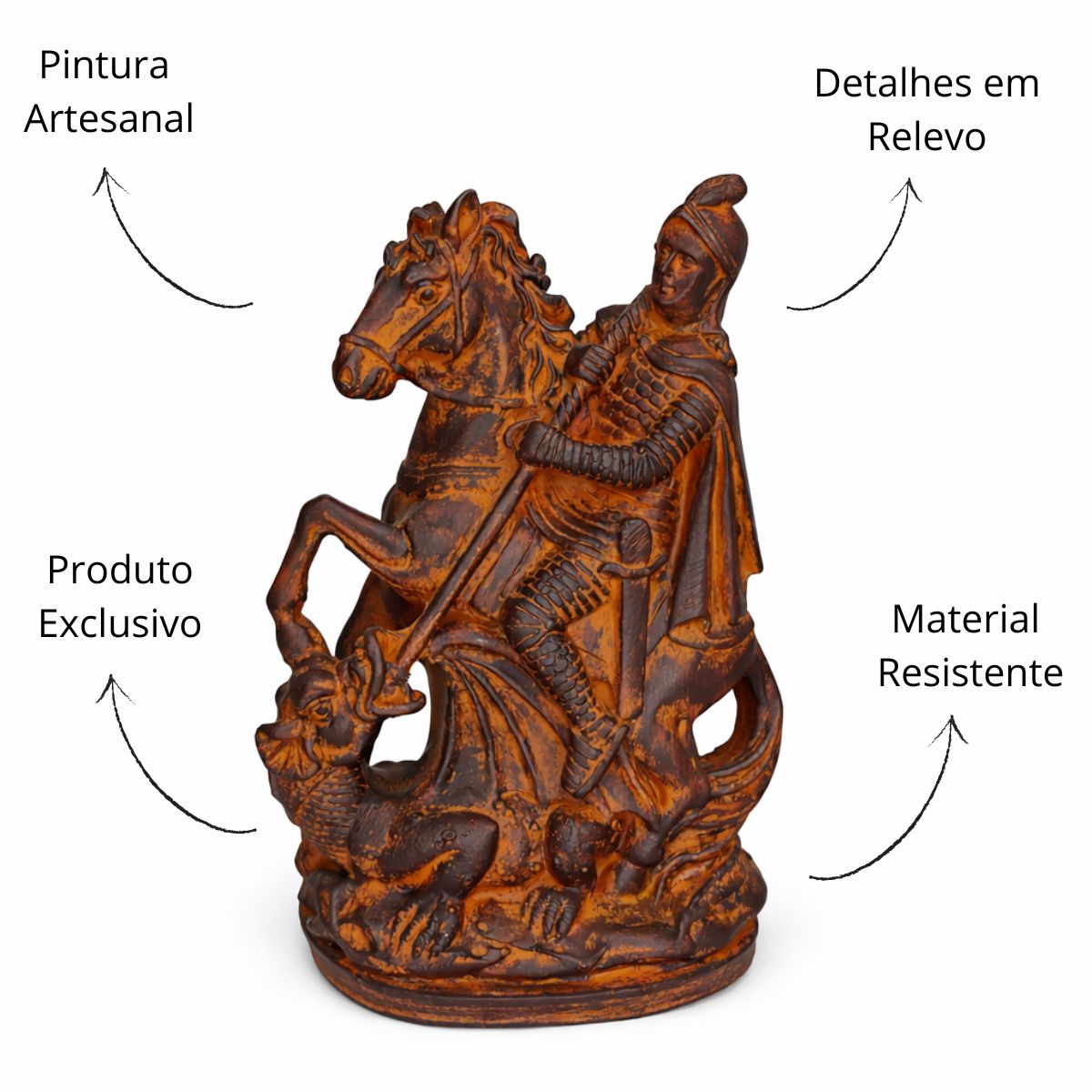 A peça é pintada de forma artesanal, com um acabamento cuidadosamente elaborado para garantir detalhes minuciosos que destacam a força e a devoção de São Jorge. Cada peça é única, feita com todo o carinho e dedicação para transmitir a proteção divina e a espiritualidade.