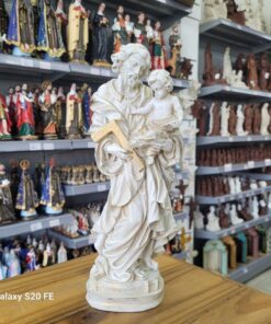Com 31 cm de altura e 10 cm de largura, a peça é cuidadosamente esculpida para refletir a tranquilidade, a sabedoria e a paternidade acolhedora de São José, sendo ideal para quem busca a proteção e a orientação divina na vida familiar.