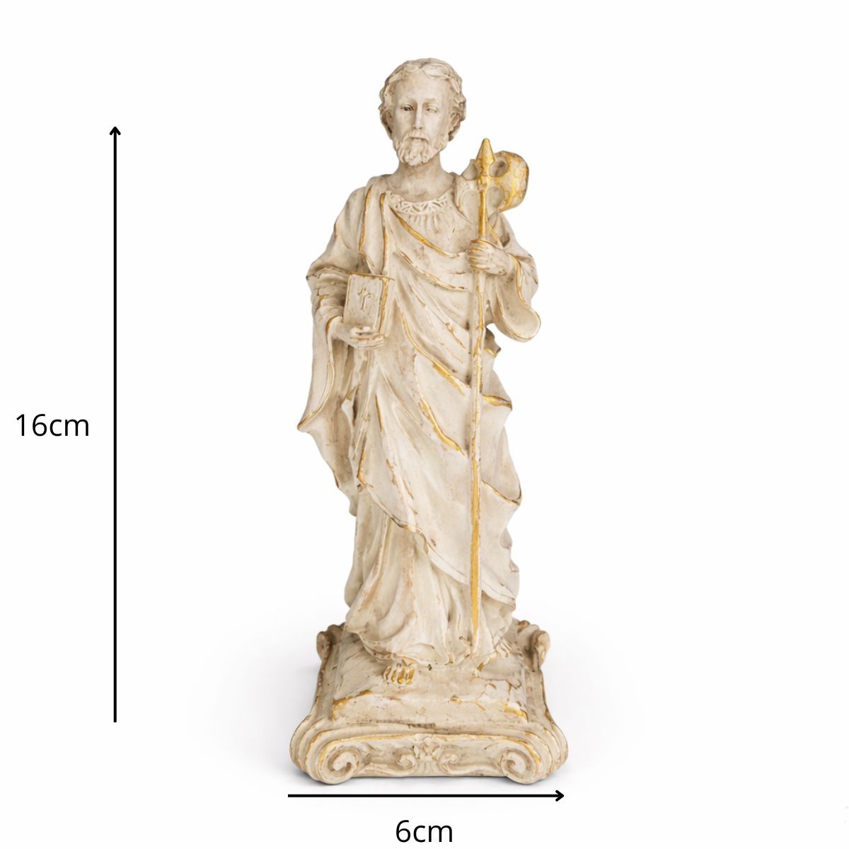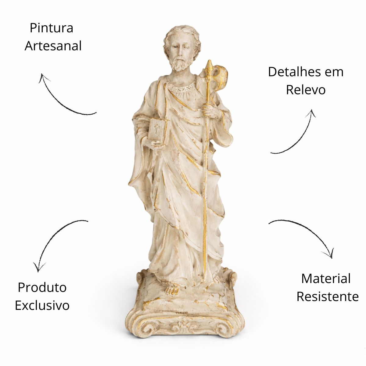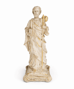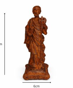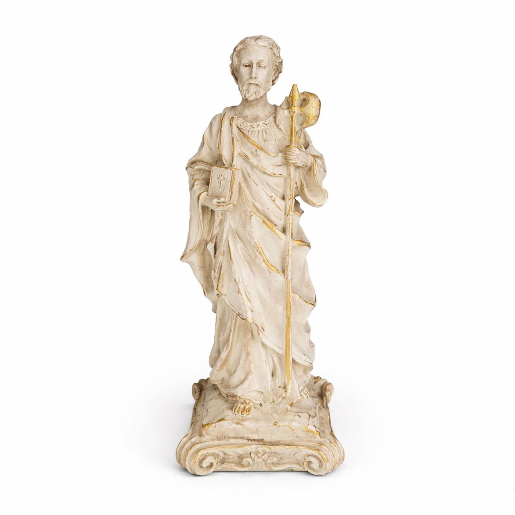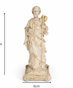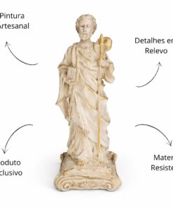 Esta imagem, feita em resina com pintura 100% artesanal, retrata São Judas Tadeu com o medalhão de Cristo sobre o peito e o bastão apostólico nas mãos, símbolos de sua fé e missão evangelizadora. É uma peça que traz conforto espiritual e reforça a presença divina no lar.