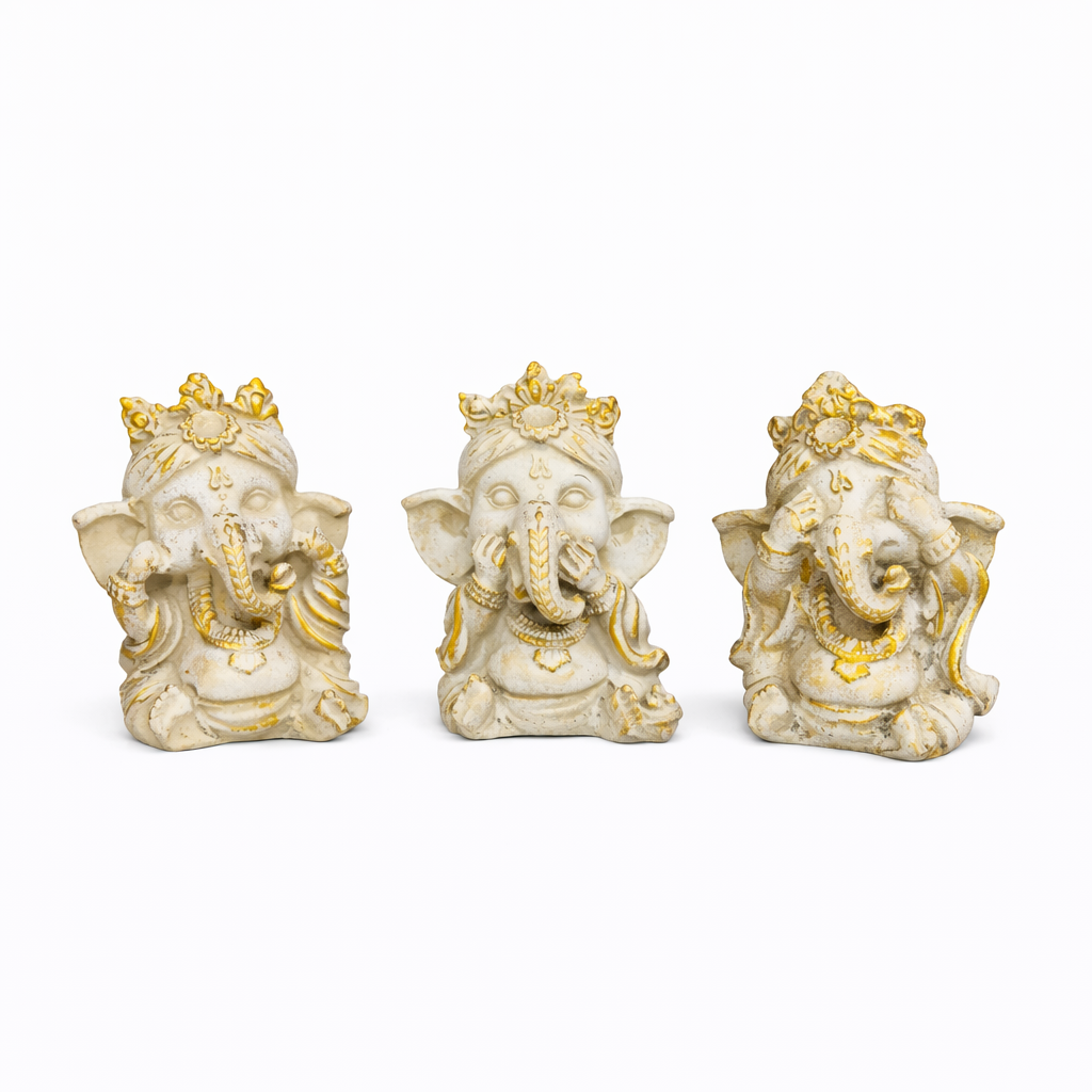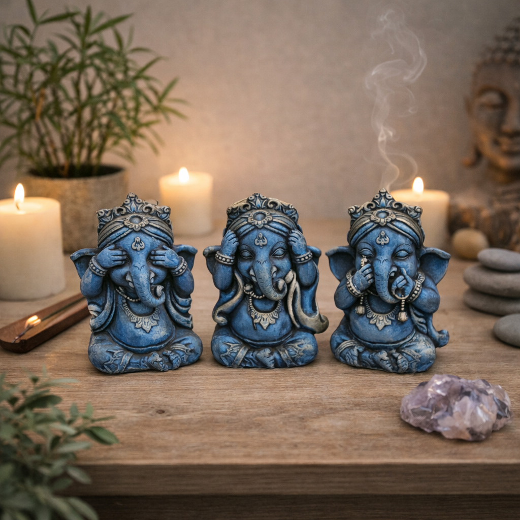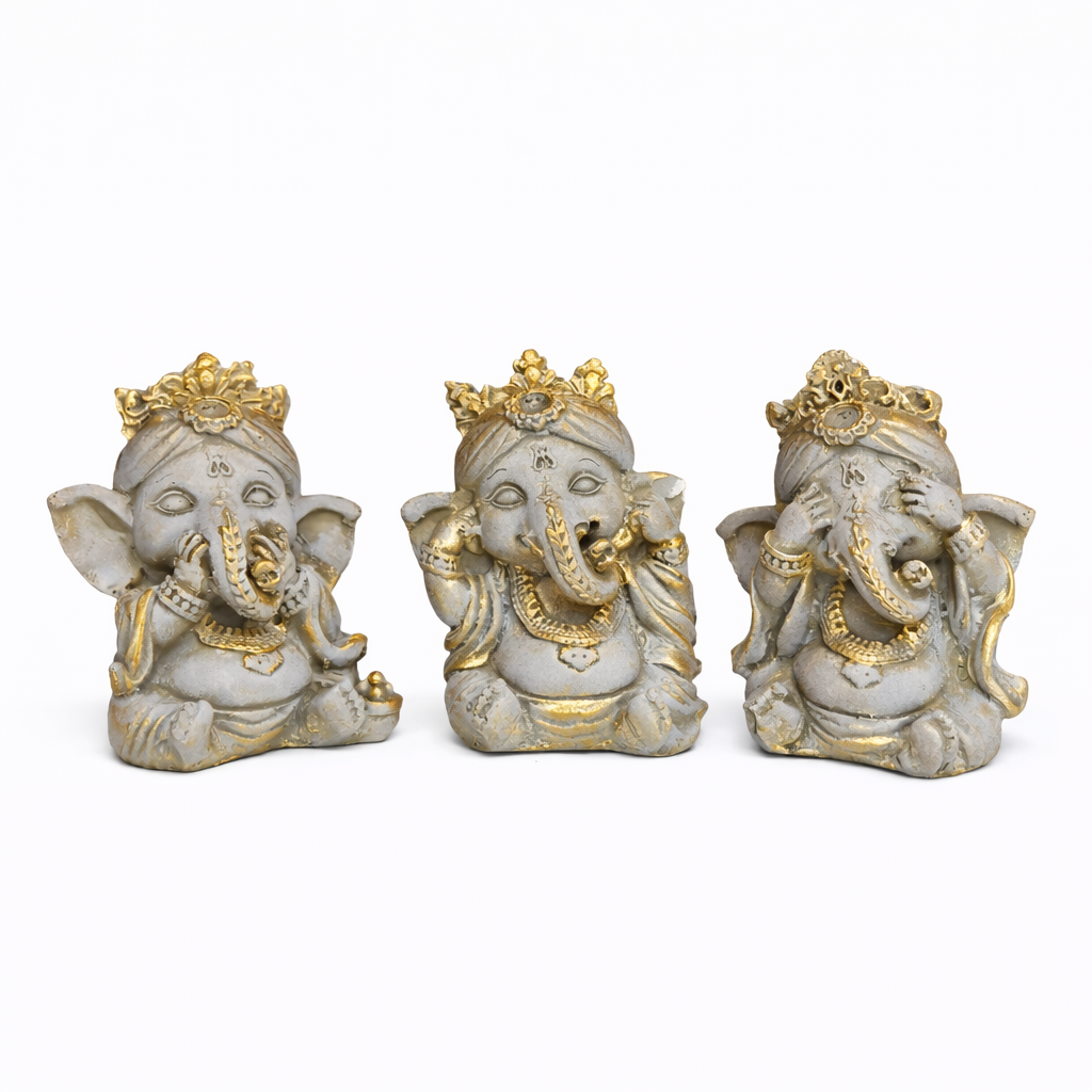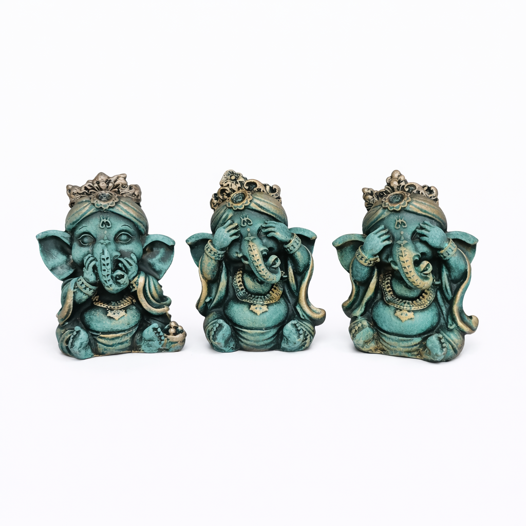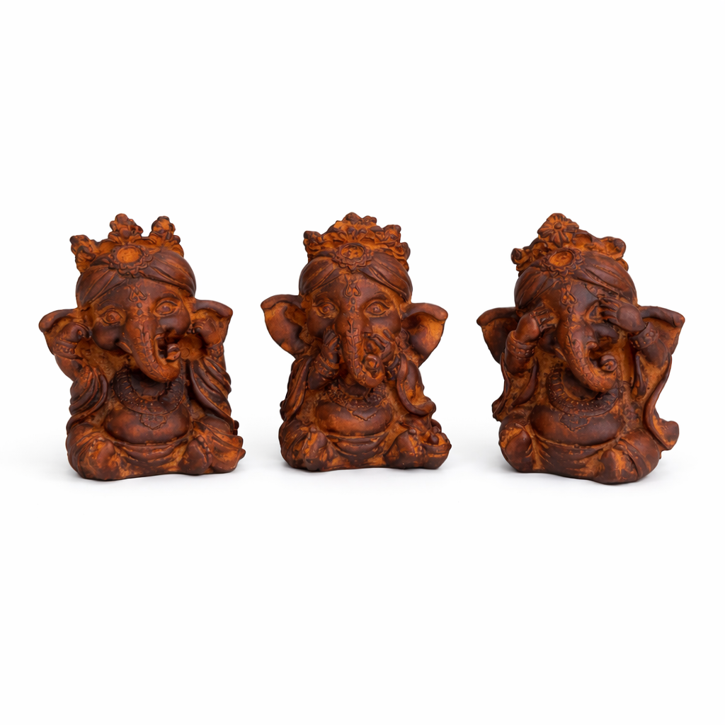 Design: Trio de Ganeshas em posições simbólicas, representando o controle dos sentidos e a busca pela paz interior