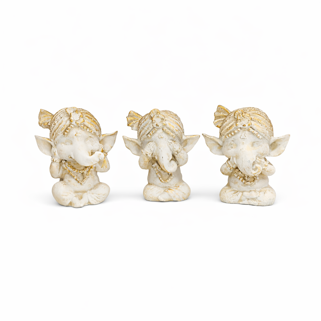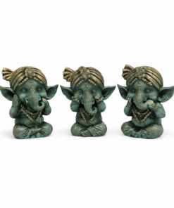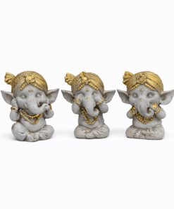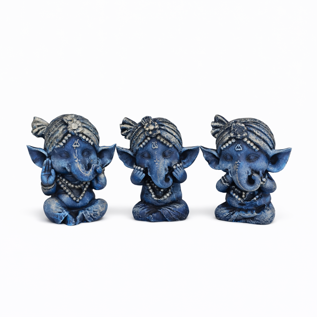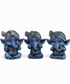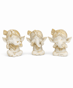 Traga boas energias e proteção para o seu ambiente com este trio de Ganesha da sabedoria, representando os ensinamentos “Não vejo o mal, não falo o mal e não ouço o mal”. Símbolo de pureza, equilíbrio e sabedoria interior, essas pequenas esculturas são perfeitas para inspirar harmonia e positividade no dia a dia.