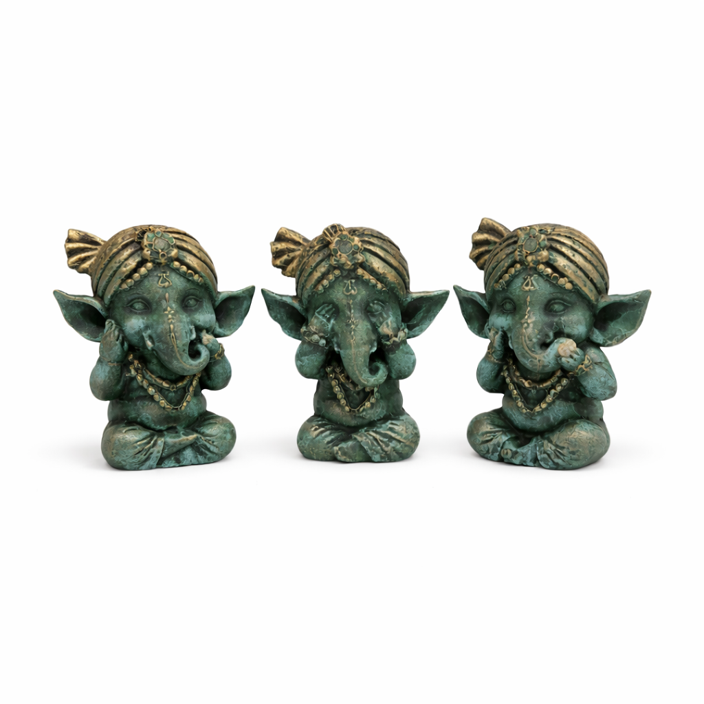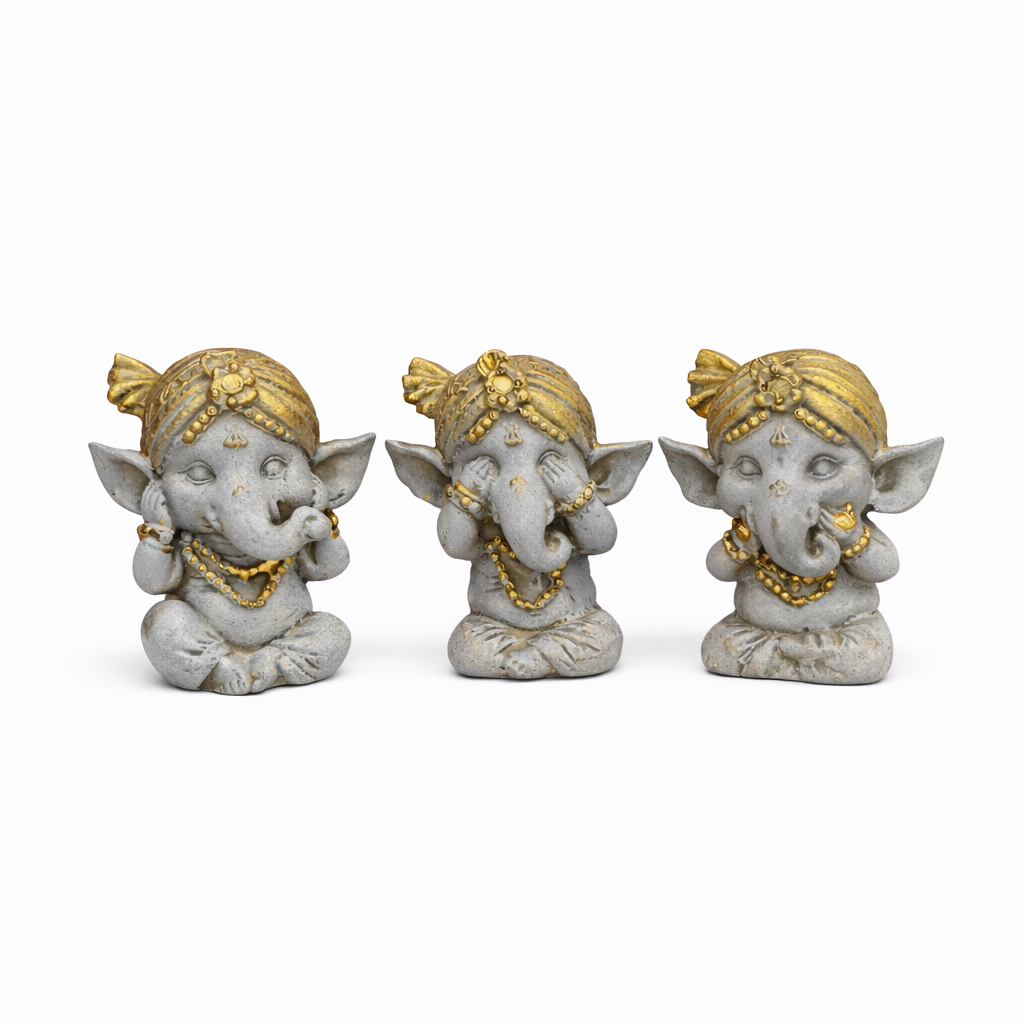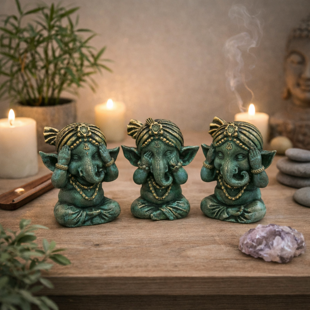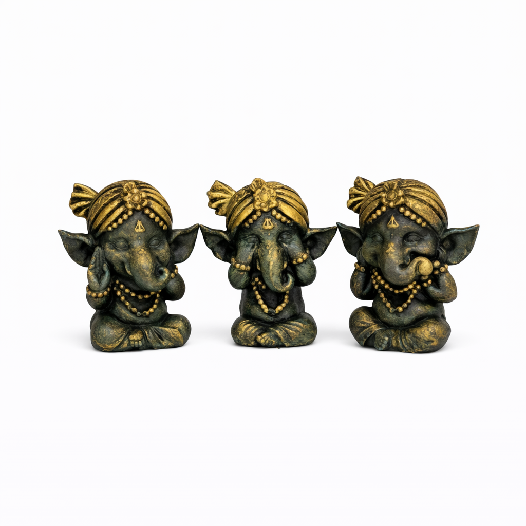Design: Trio de Ganeshas em posições simbólicas, representando o controle dos sentidos e a busca pela paz interior